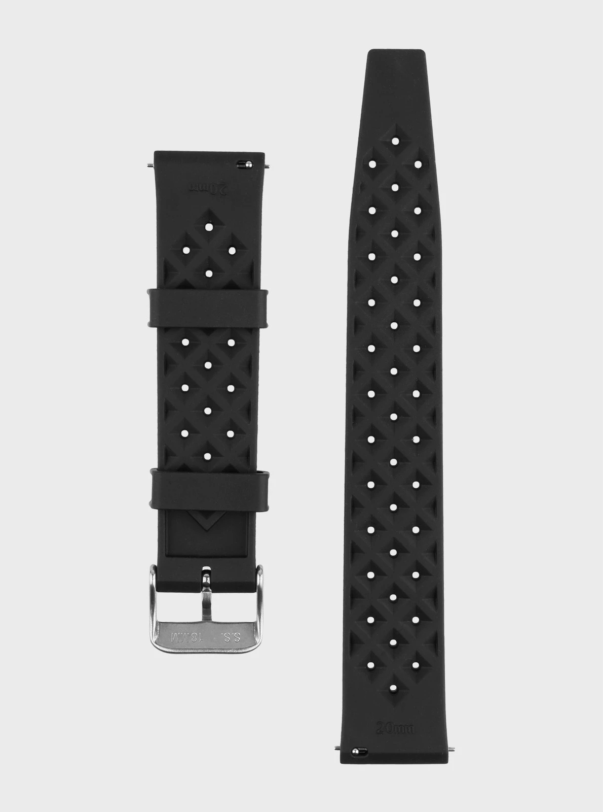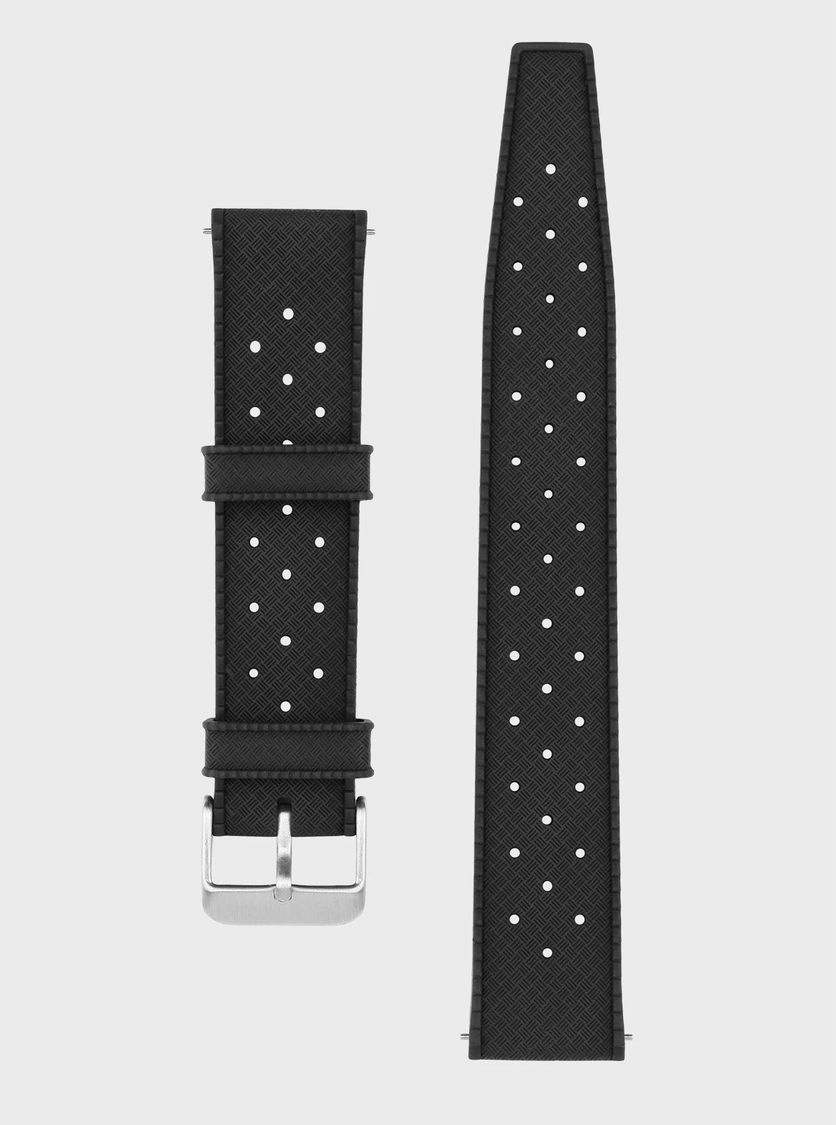 Introducing our "Tropic" bracelet, a classic revived from the sixties, like Kelton. The Tropic bracelet has always been the faithful companion of divers and other water sports enthusiasts, thanks to two major qualities: flexibility and resistance. Our Tropic bracelet, which today equips the 1955 models, is made - as it was then - from vulcanized natural rubber, a process that uses high temperatures and sulfur to modify the rubber's structure and make it more resistant without altering its suppleness.