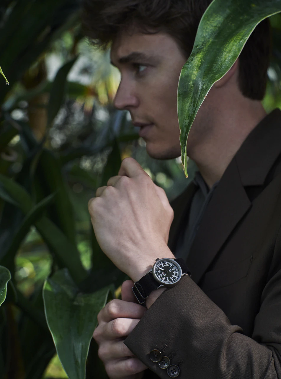 Ce modèle est équipé d’un bracelet NATO en cuir disponible en 3 couleurs, forêt, sable et carbone.