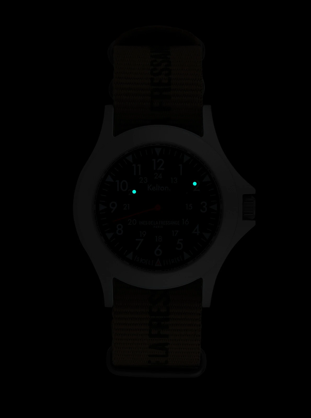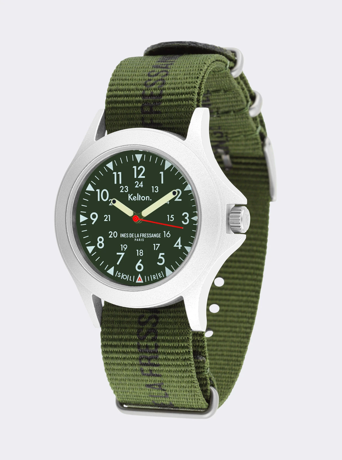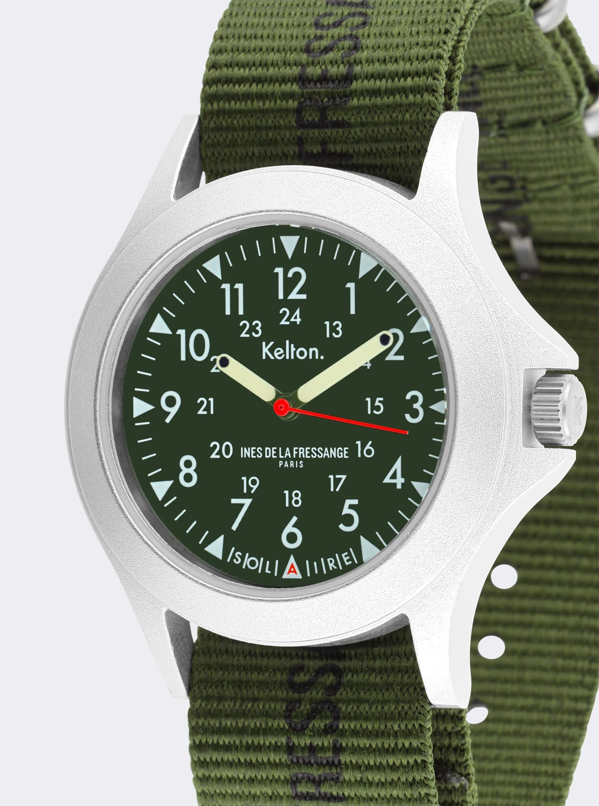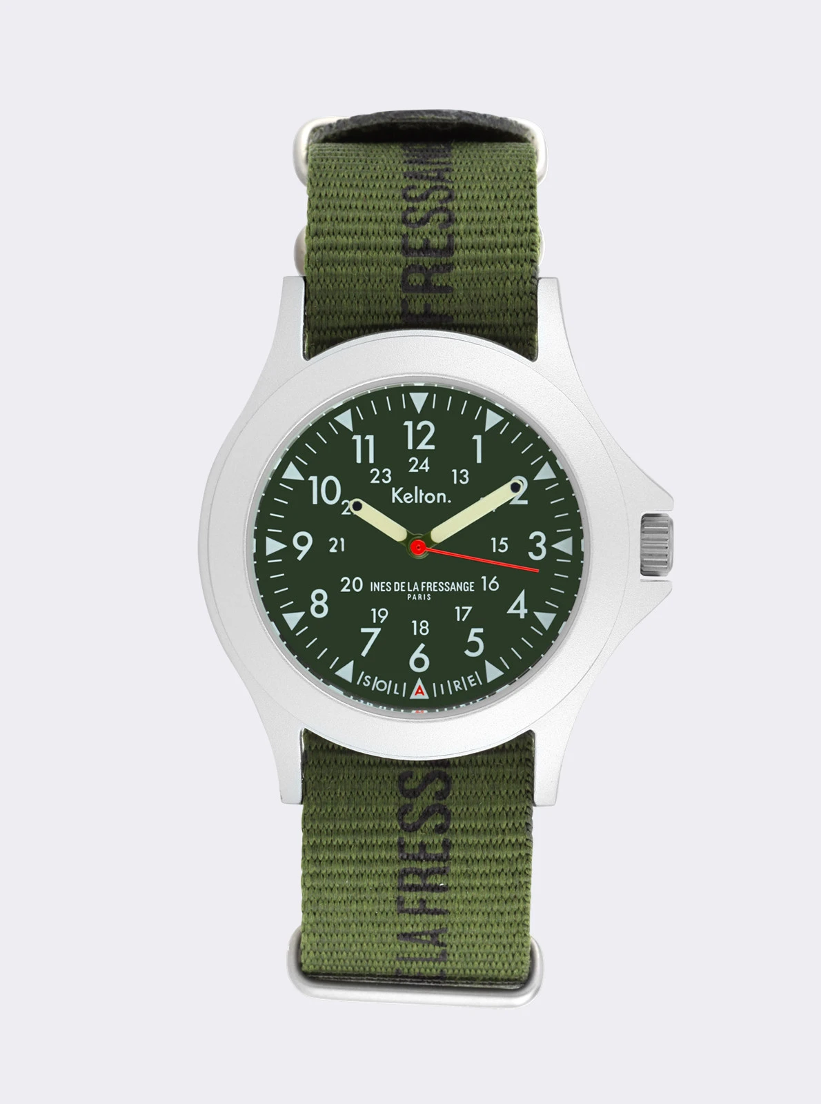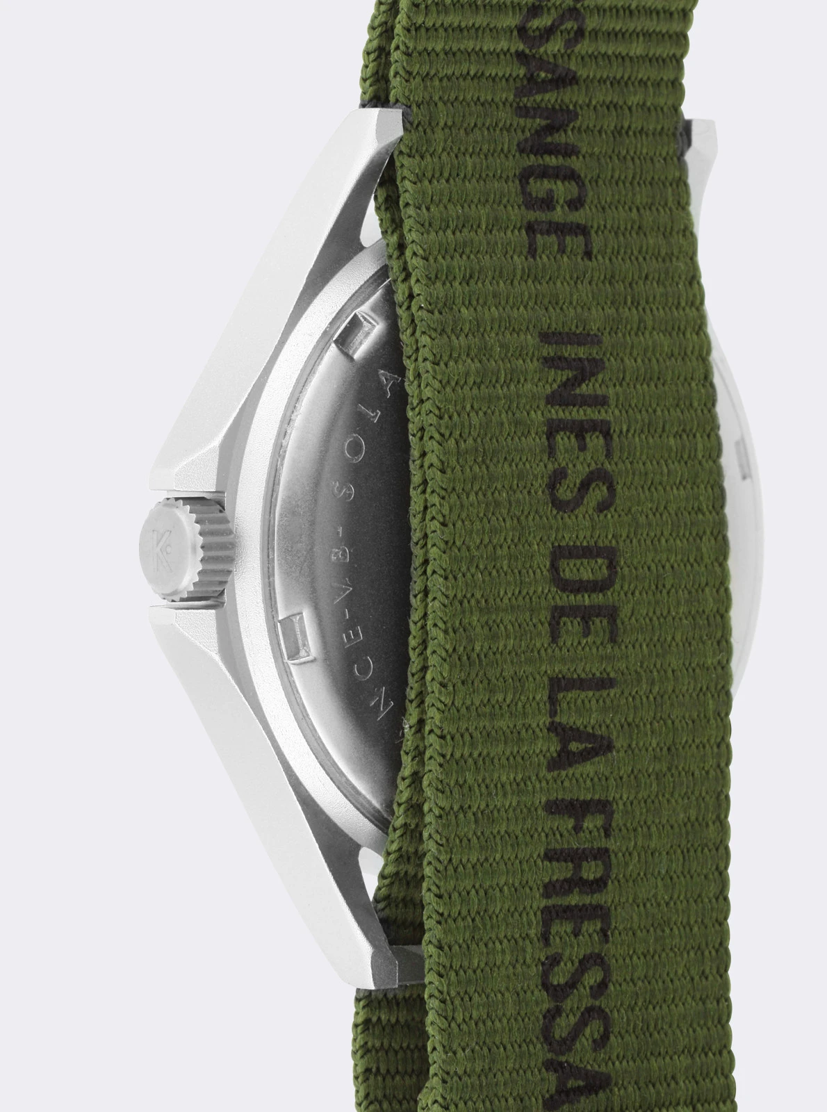 The Solaire Field kaki is designed and assembled in France. This watch plays with the elements - it recharges in the sun - but also with styles, adopting an aesthetic and colors borrowed from the military, an eternal source of fashion inspiration. The watch has a lightweight, infinitely recyclable aluminum case, and its textile strap is made from recycled materials (Rpet) in the natural colors of sandy "field" clothing.