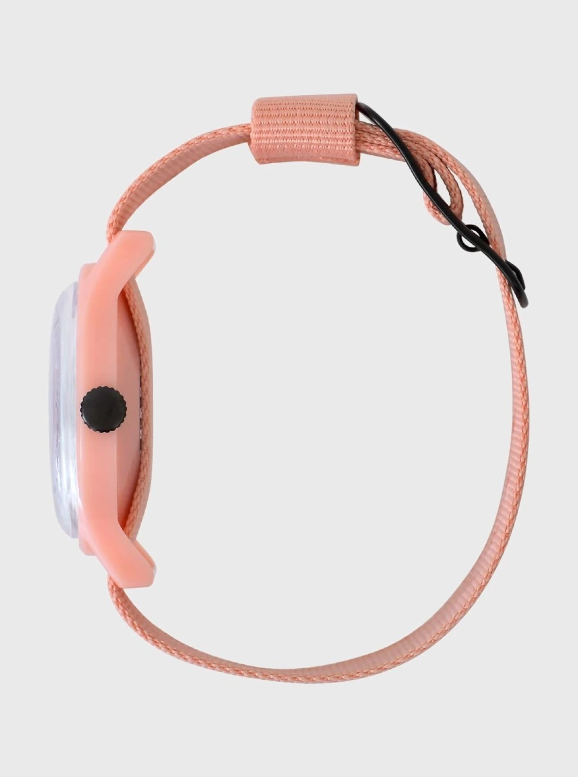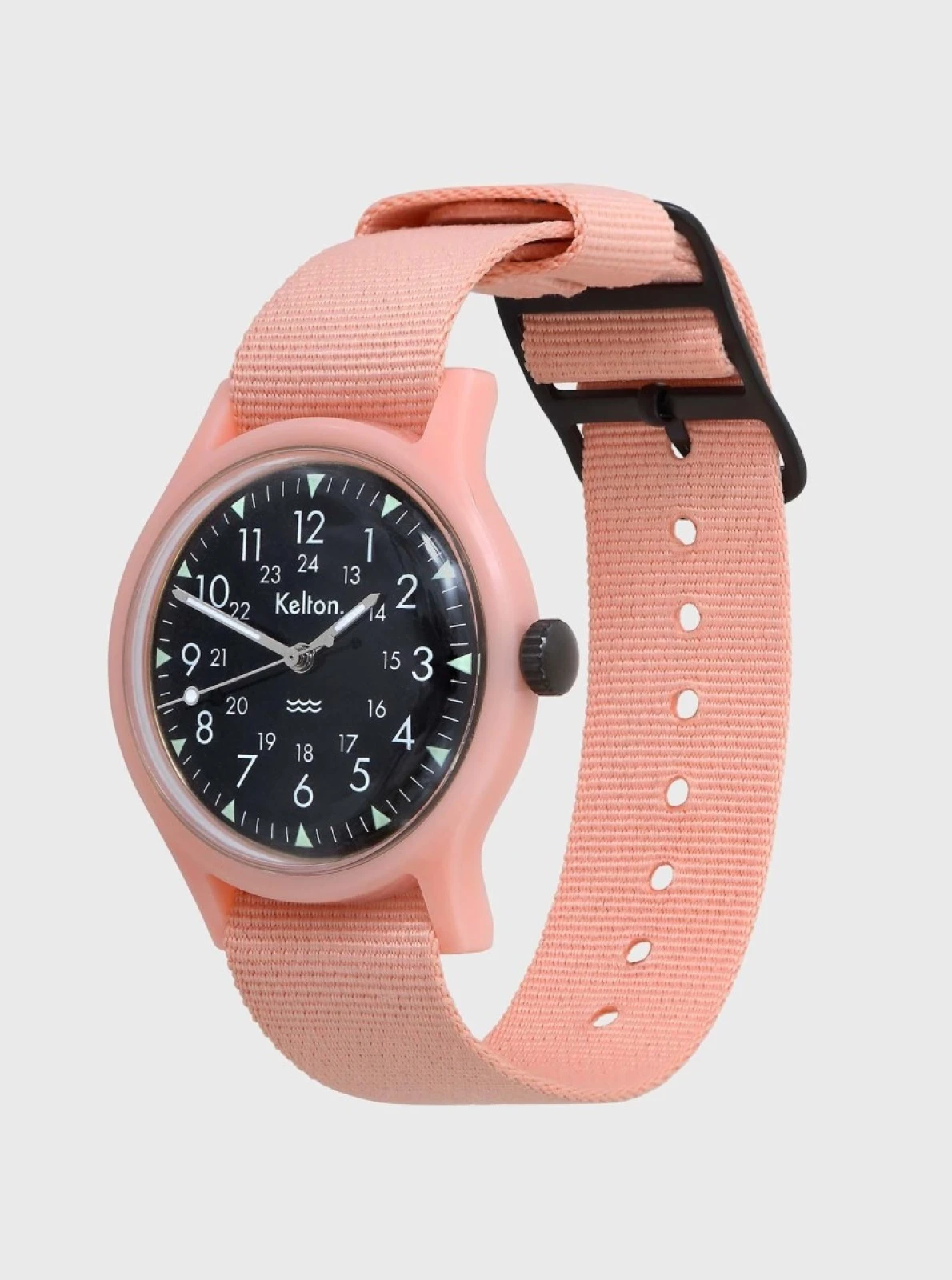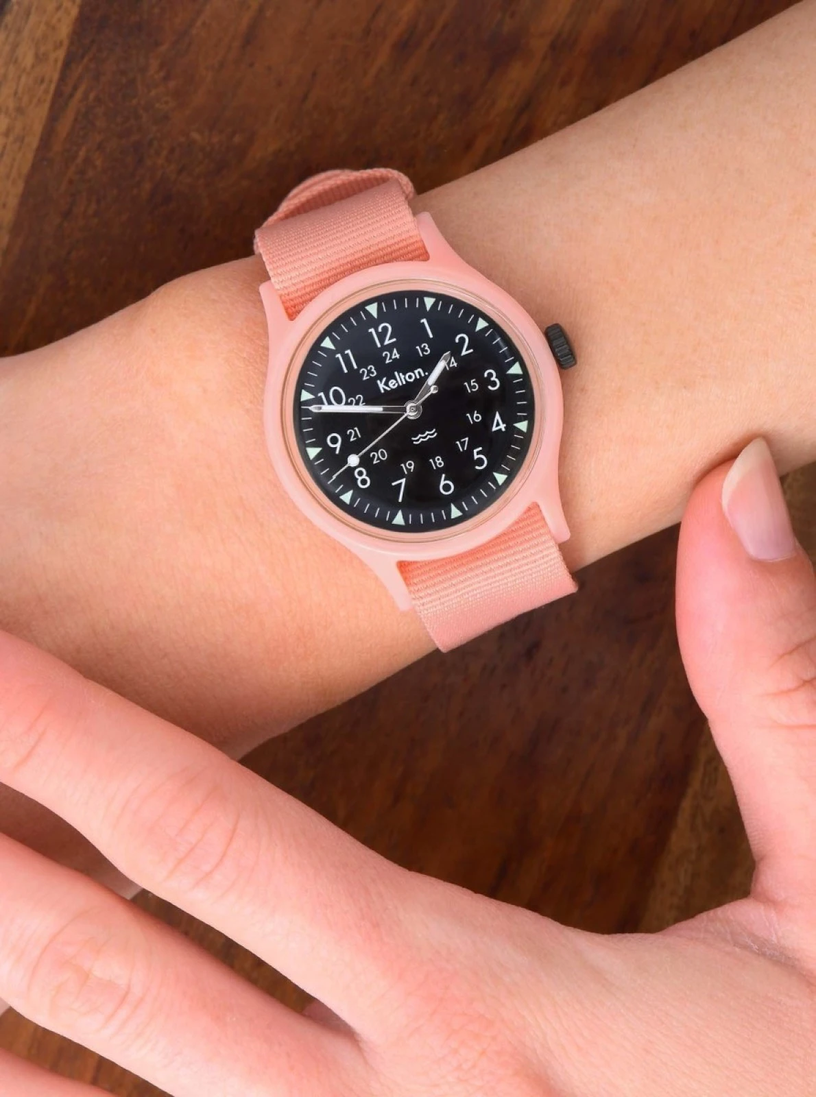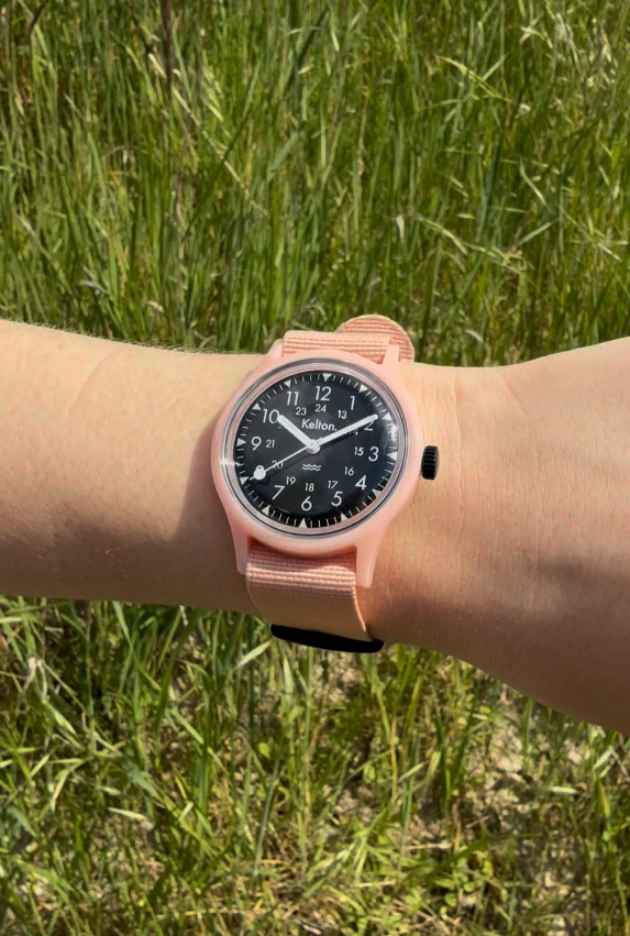 "The Jungle model is a military-inspired classic and is declined in the colors of our planet: lava from the volcanoes, blue from the precious Arctic glaciers, jungle from Sumatra, black from the carbon we are made of. This watch loves nature and contributes to its protection, doubly so. Its mechanical movement does not require a battery ,raising the level of the battery is done by hand and its bracelet is made of rPet."