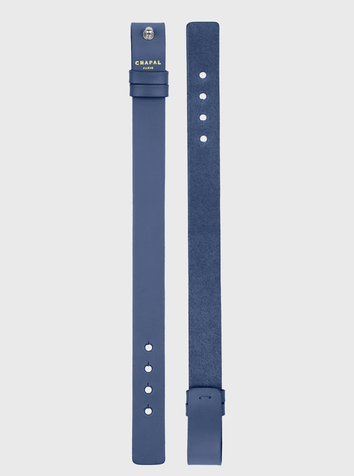 One piece of leather and two loops. Made of vegetable-tanned box leather, equipped with a brass button clasp and hot-stamped with the Chapal Paris logo. Tanned and manufactured in the Chapal workshops in Crocq (Creuse), France.