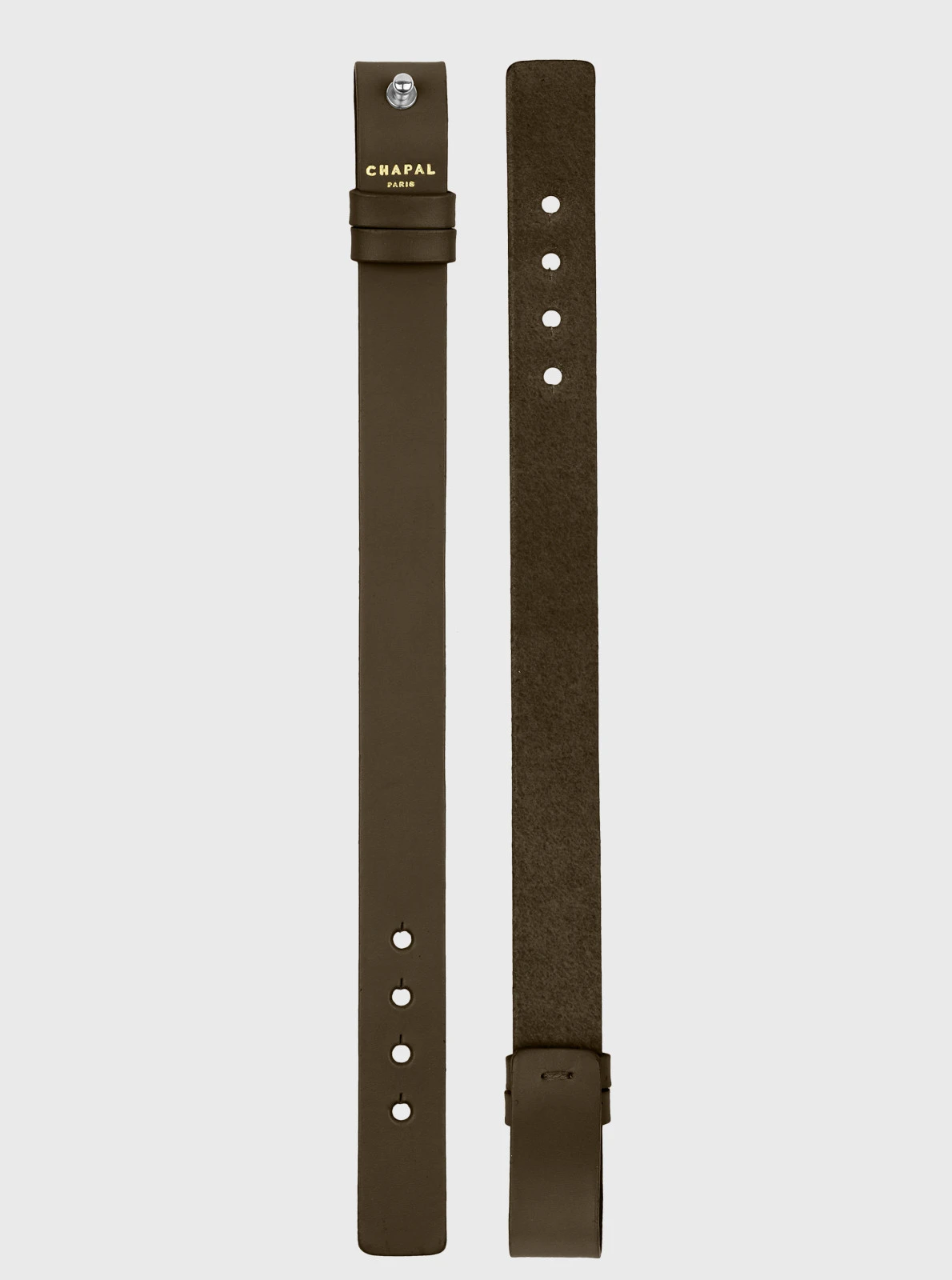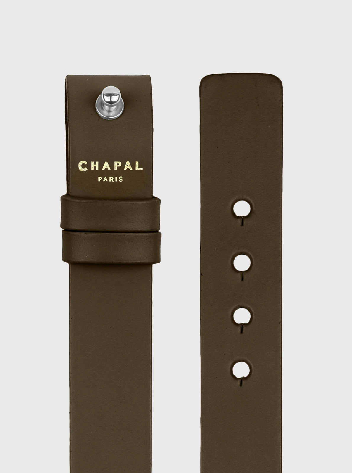 One piece of leather and two loops. Made of vegetable-tanned box leather, equipped with a brass button clasp and hot-stamped with the Chapal Paris logo. Tanned and manufactured in the Chapal workshops in Crocq (Creuse), France.