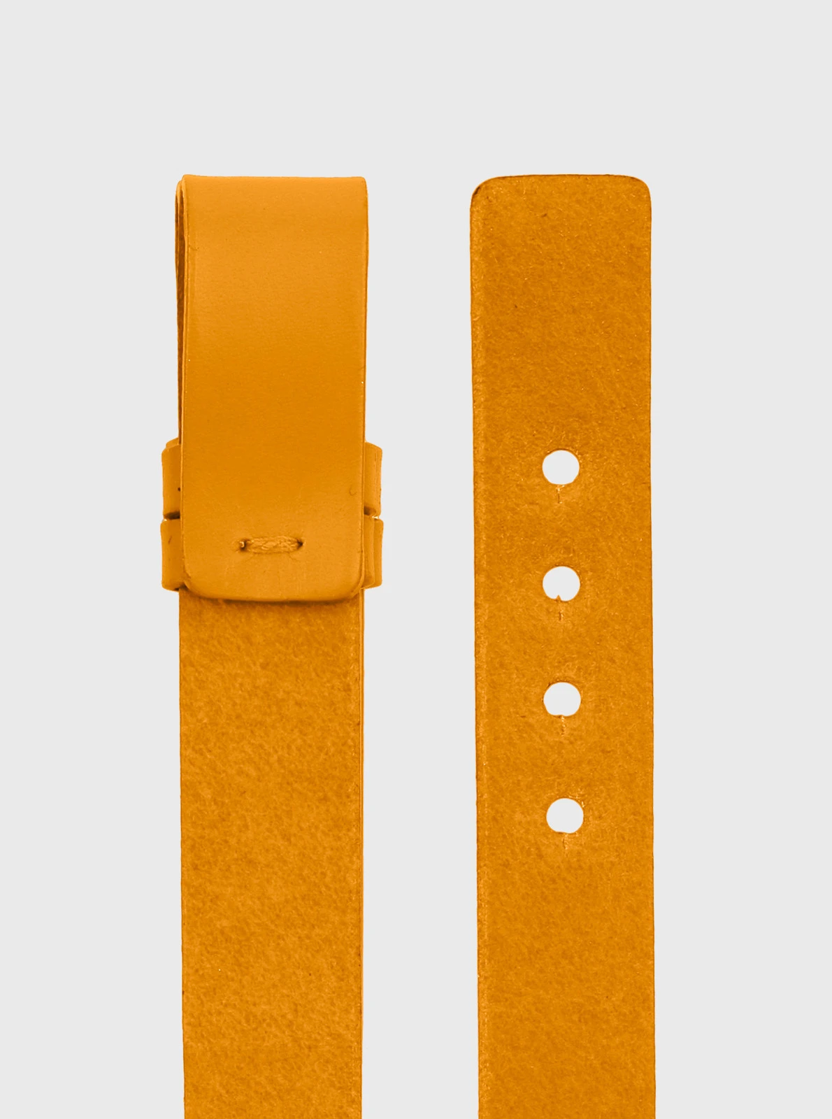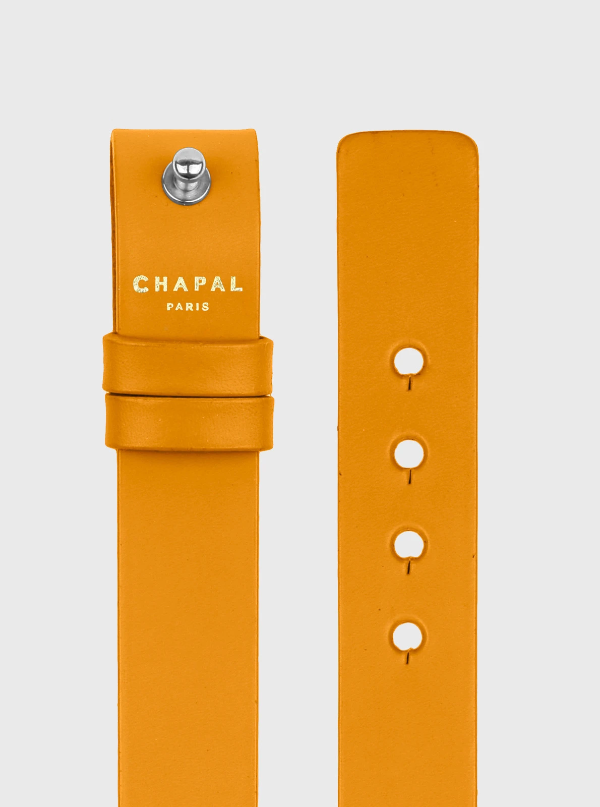 One piece of leather and two loops. Made of vegetable-tanned box leather, equipped with a brass button clasp and hot-stamped with the Chapal Paris logo. Tanned and manufactured in the Chapal workshops in Crocq (Creuse), France.