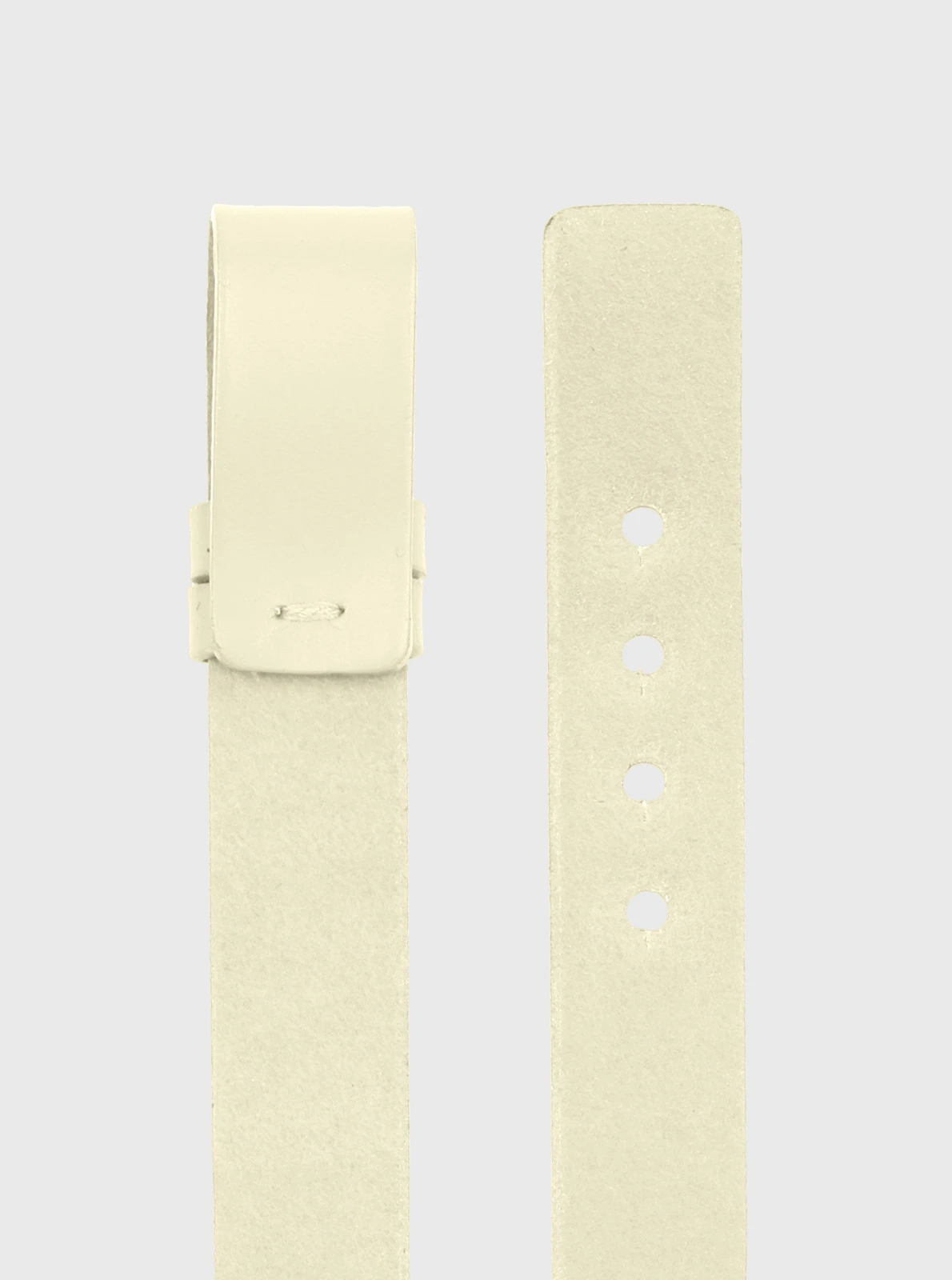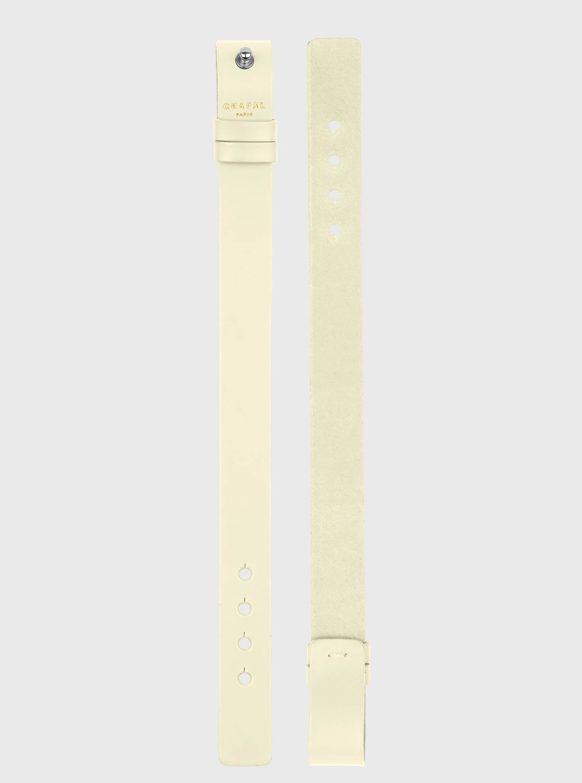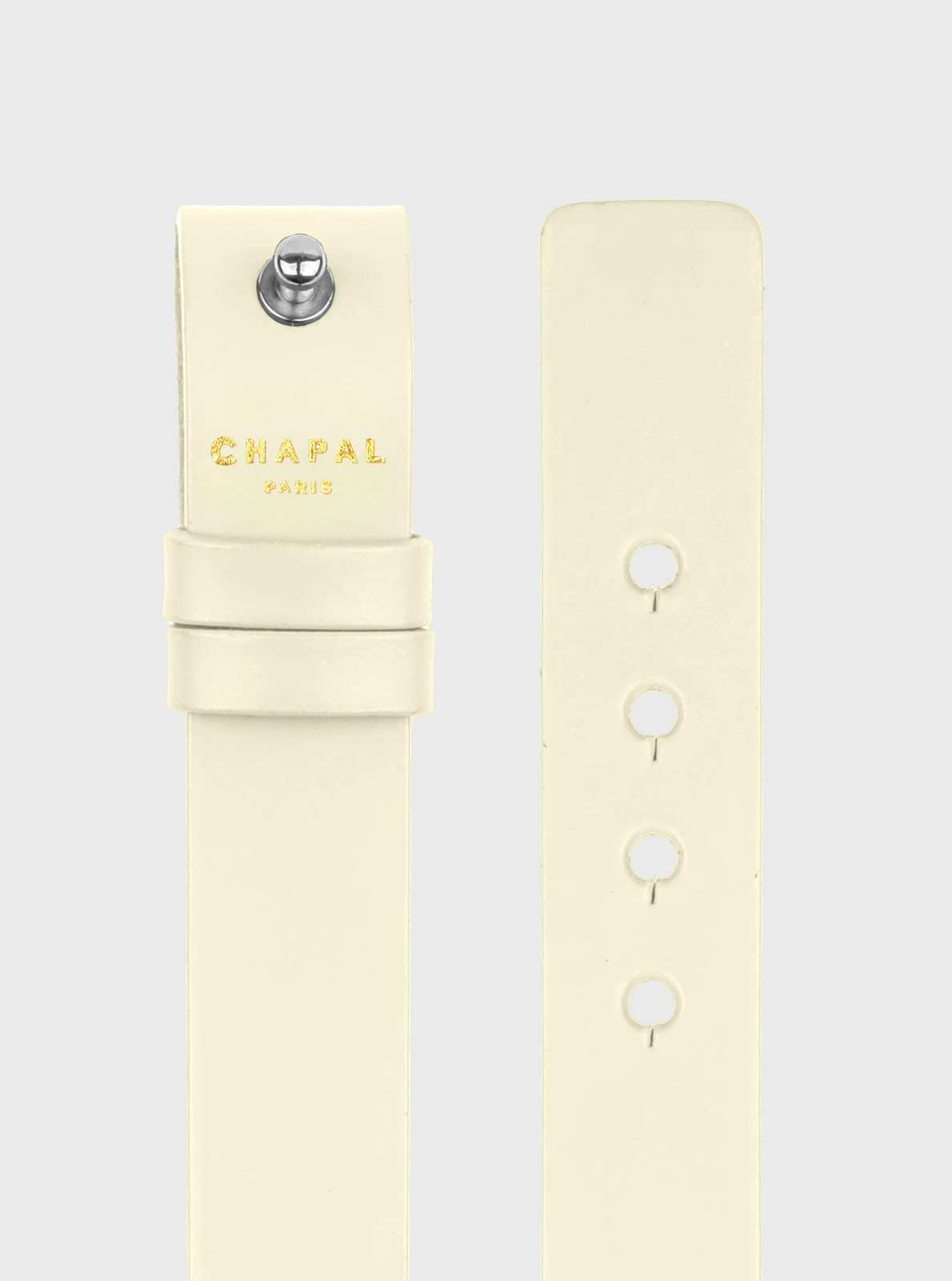 One piece of leather and two loops. Made of vegetable-tanned box leather, equipped with a brass button clasp and hot-stamped with the Chapal Paris logo. Tanned and manufactured in the Chapal workshops in Crocq (Creuse), France.