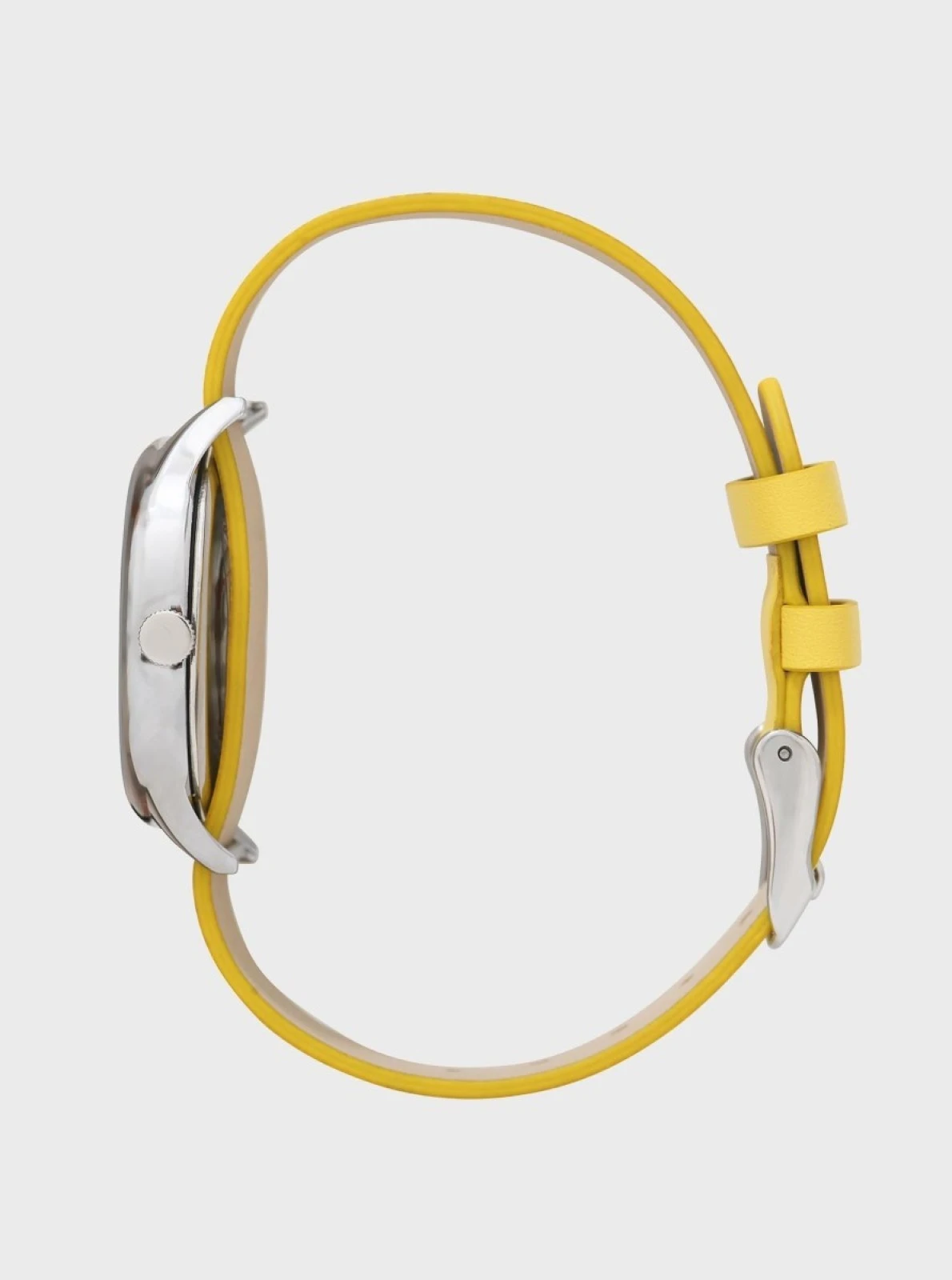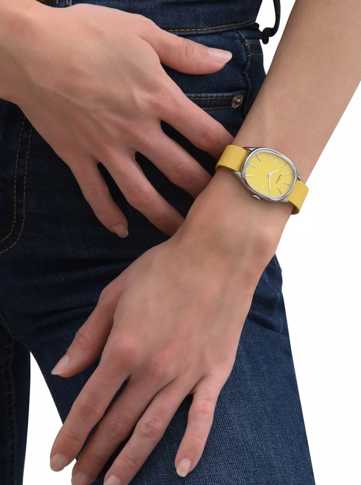 TECHNIQUE Référence 9123342 Entrecorne 14 mm Hauteur corne à corne 38 mm Épaisseur 7 mm Diamètre du boîtier 28-32 mm Boîtier Laiton Couleur du cadran Jaune Verre Minéral Étanchéité 3 ATM Poids total 23 g Type de mouvement Quartz Mouvement Miyota super slim Conçue et assemblée en France.