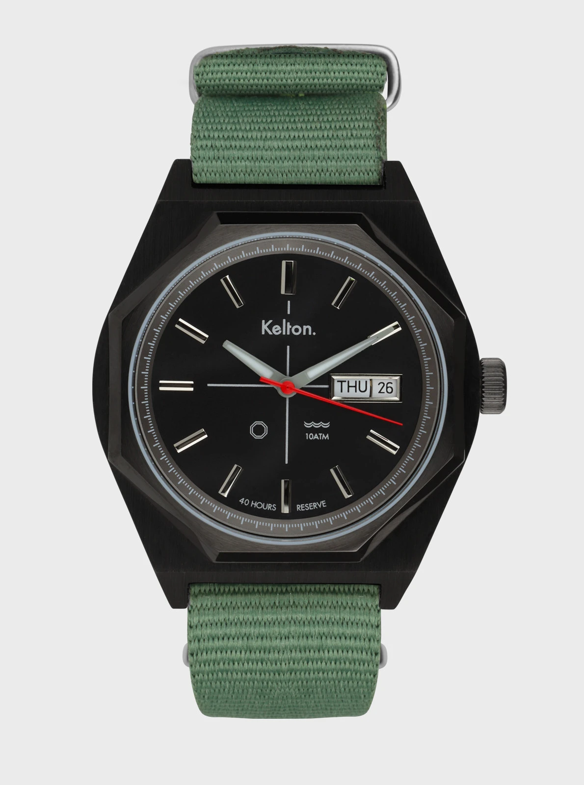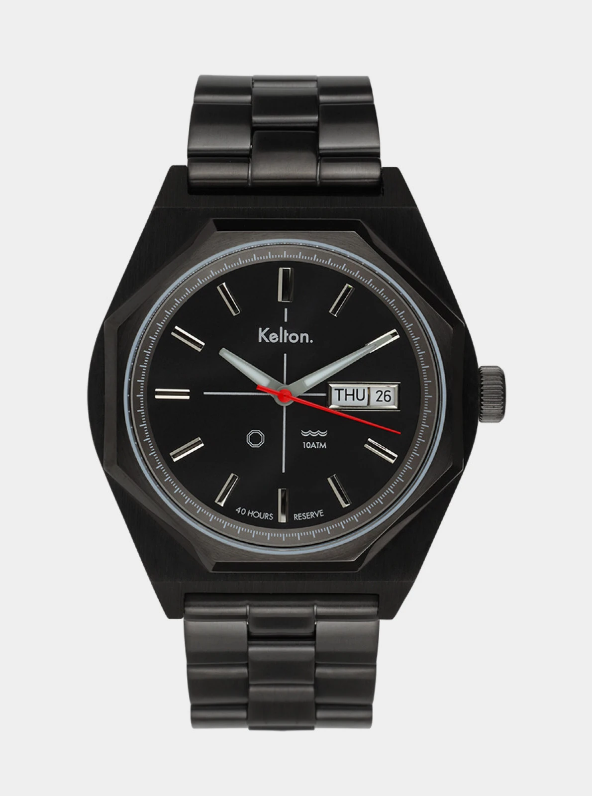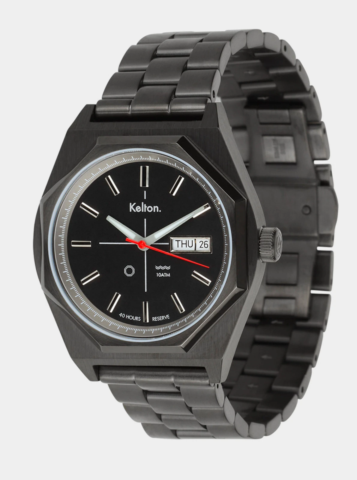 Ici, nous avons optimisé les potentiels immenses de ce modèle Kelton de la fin des années 70. Tout d’abord en re-dessinant son boitier, équipé à présent d’un mouvement automatique jour/date Seagull 1632. Ses aiguilles (heures et minutes) traitées au Superluminova sont devenues luminescentes, enfin, nous avons utilisé un verre saphir et cette petite bombe automatique résiste maintenant à une pression de 10 ATM.
