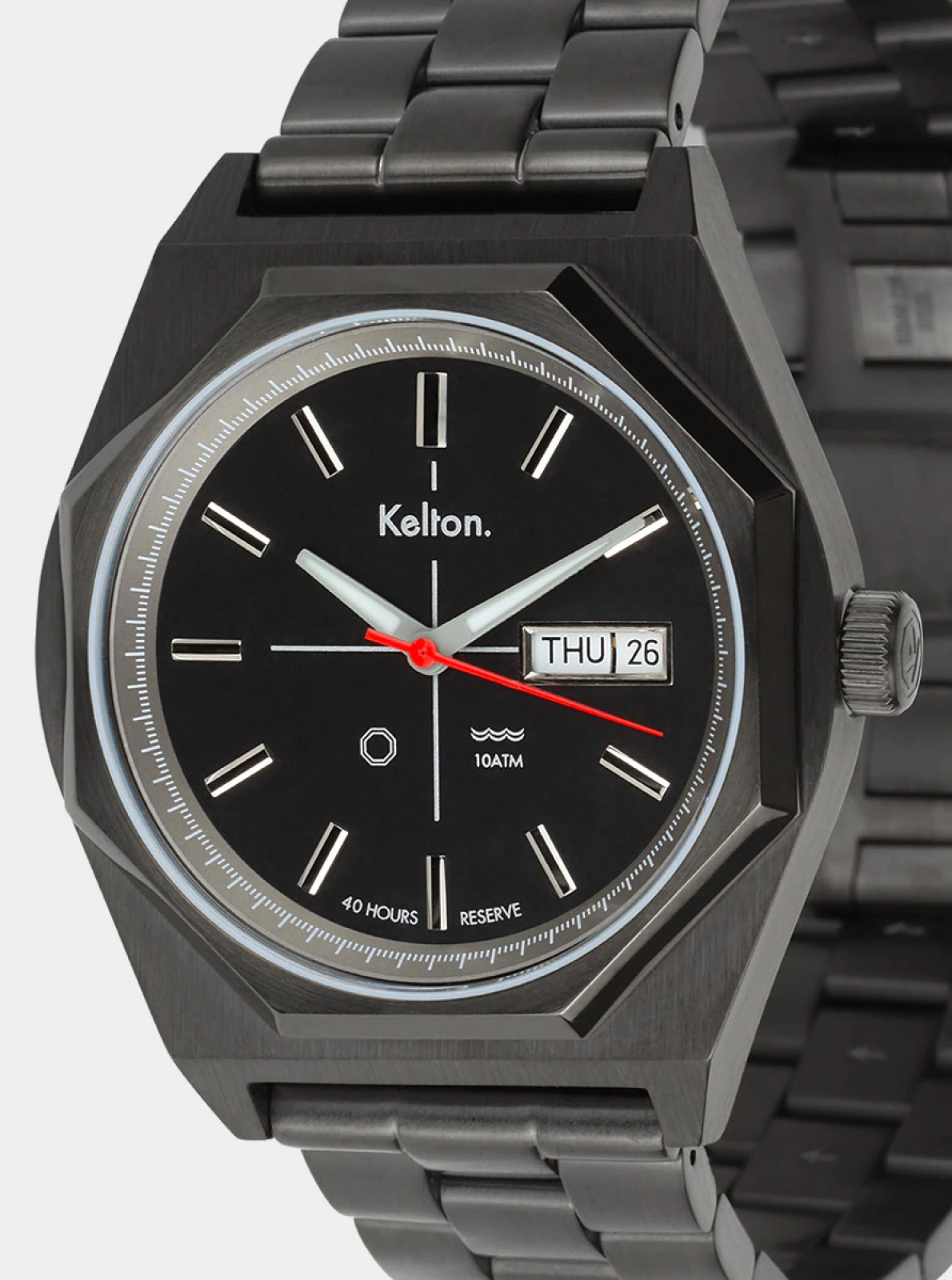 L’Octogone est, depuis que la question du futur hante le cinéma, la forme que prend à peu près tout objet à venir. Cela va des portes (dans les couloirs des vaisseaux) aux vaisseaux eux-mêmes en passant par l’architecture, les robots… D’où cette vague de modèles octogonaux apparue à la fin des décennies Space Age (70's), chez un grand nombre d’horlogers y compris Kelton, il y en a des centaines.