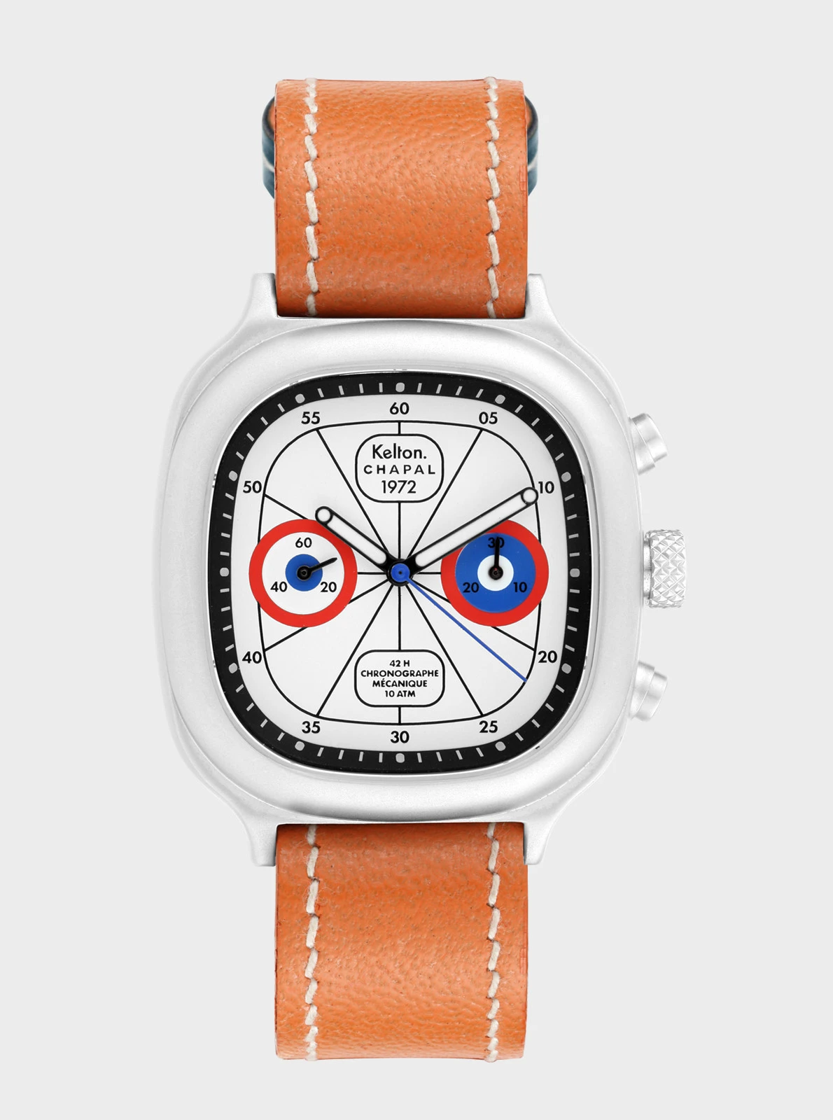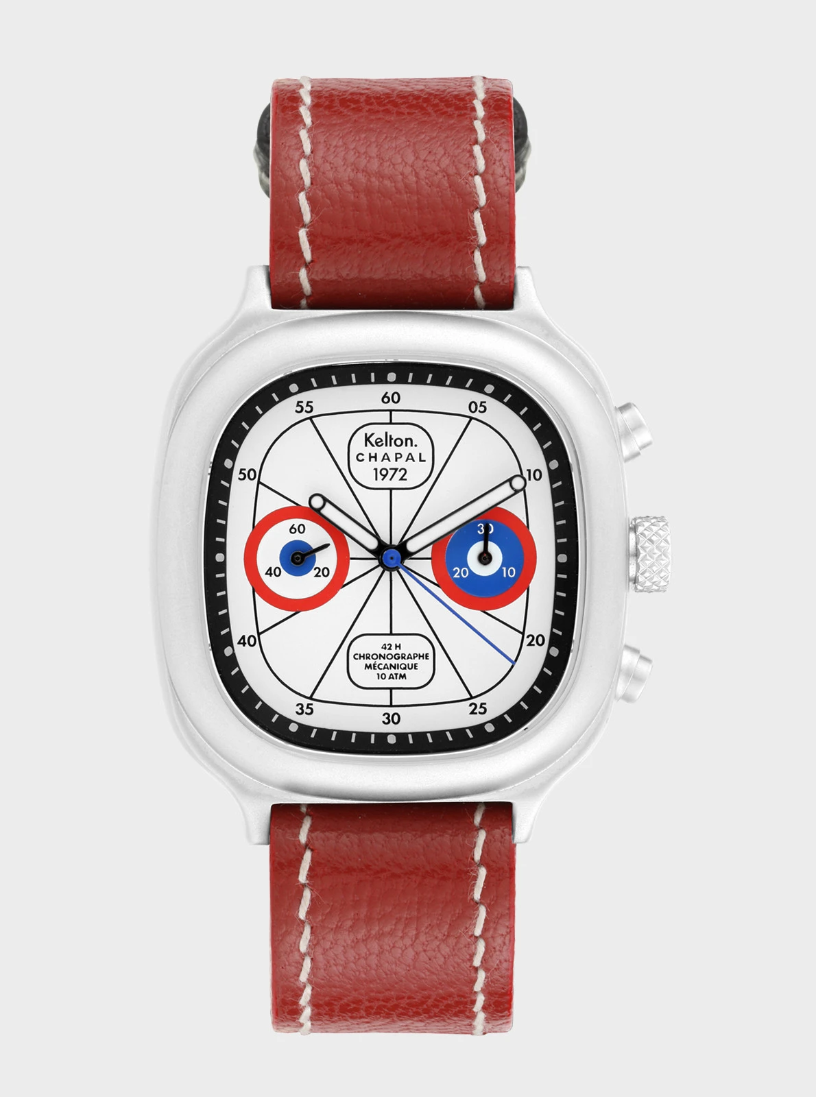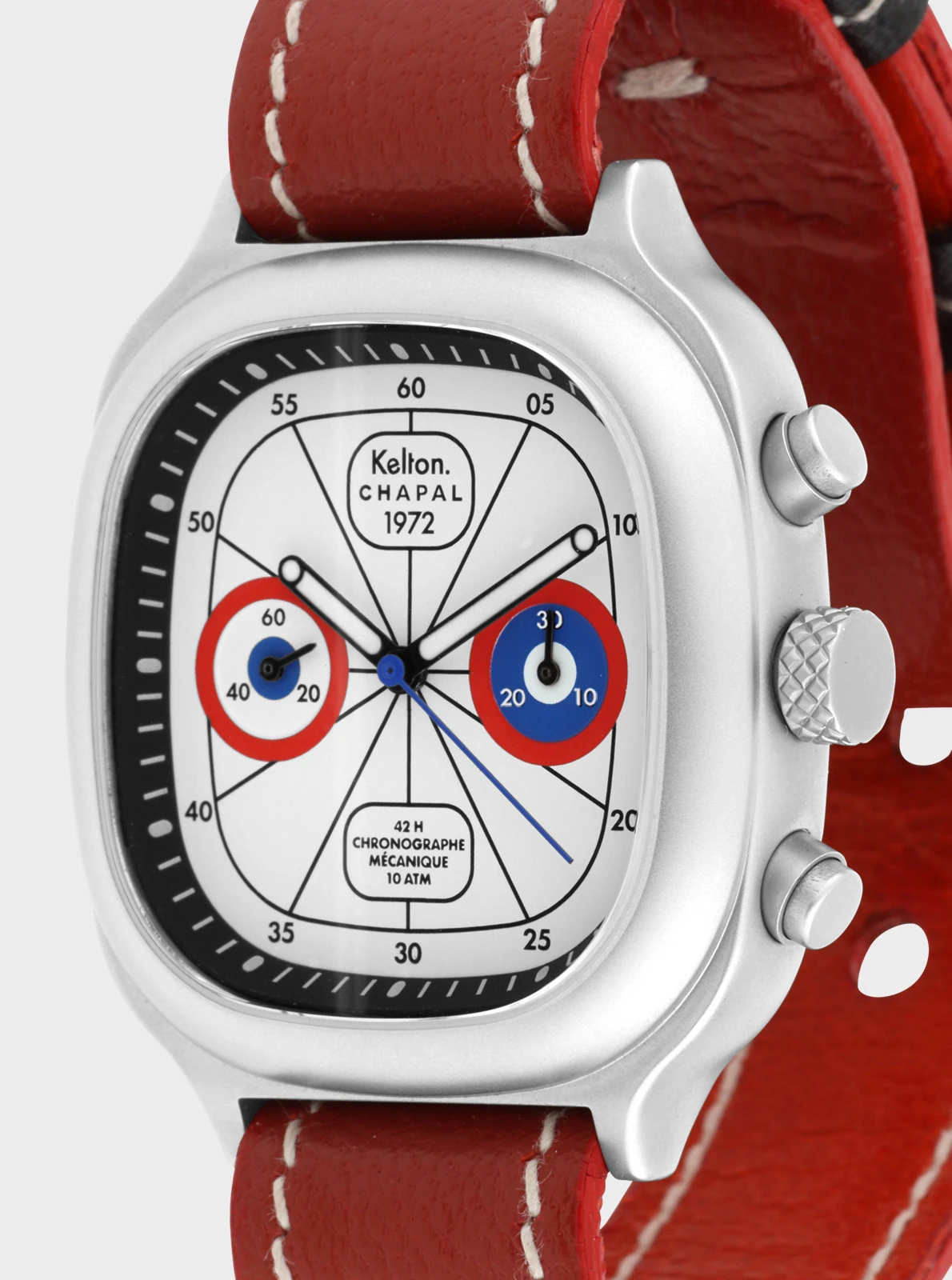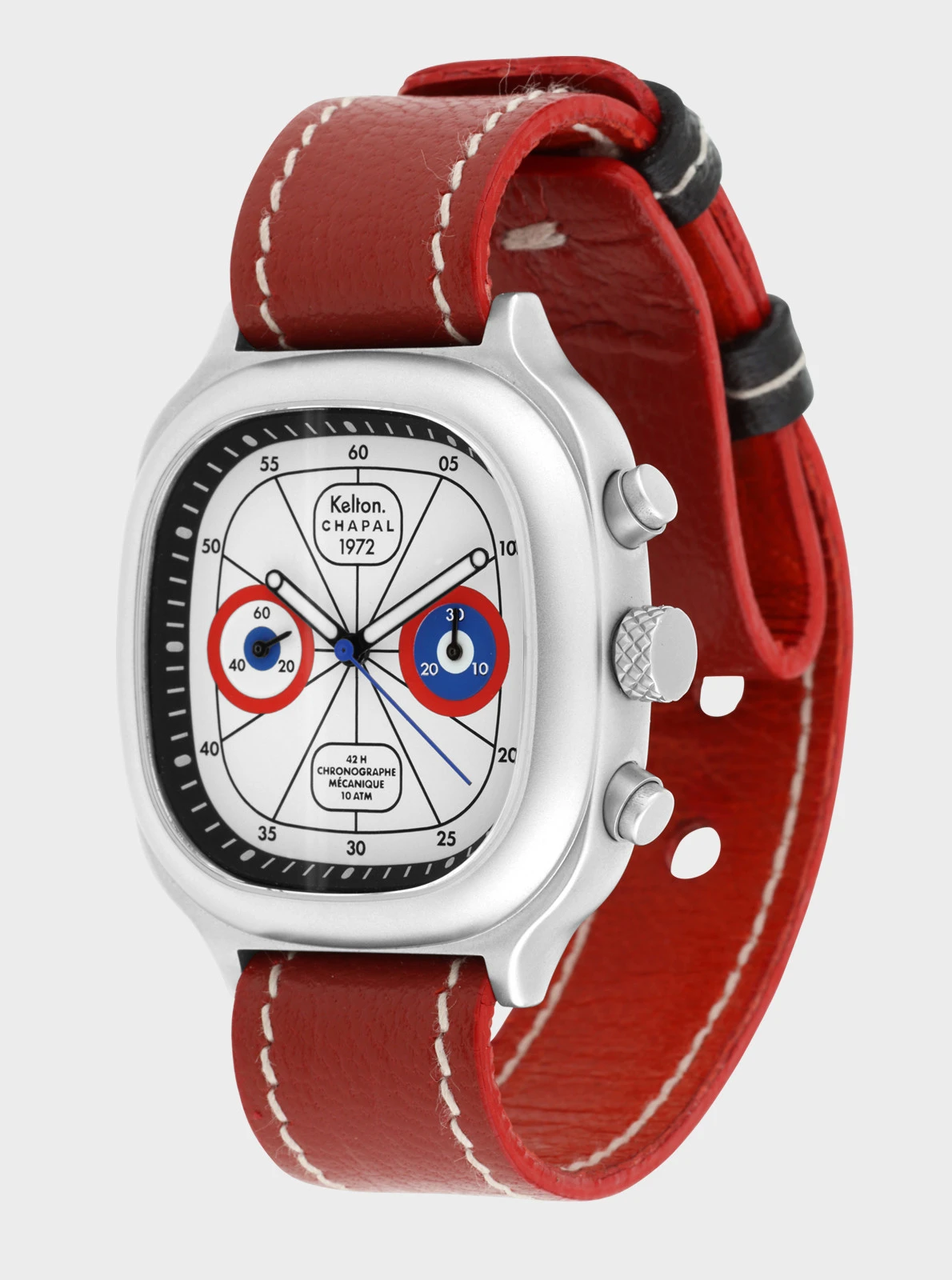 Notre chronographe 1972 fait peau neuve. Voici une nouvelle édition ultra limitée dotée d’un cadran minimaliste orné de deux cocardes aux couleurs inversées (à gauche la française, à droite, celle des états-unis (Première Guerre mondiale). Le Chrono Sky Red & Blue célèbre les histoires de Kelton et Chapal qui passent toutes deux par les État-unis.