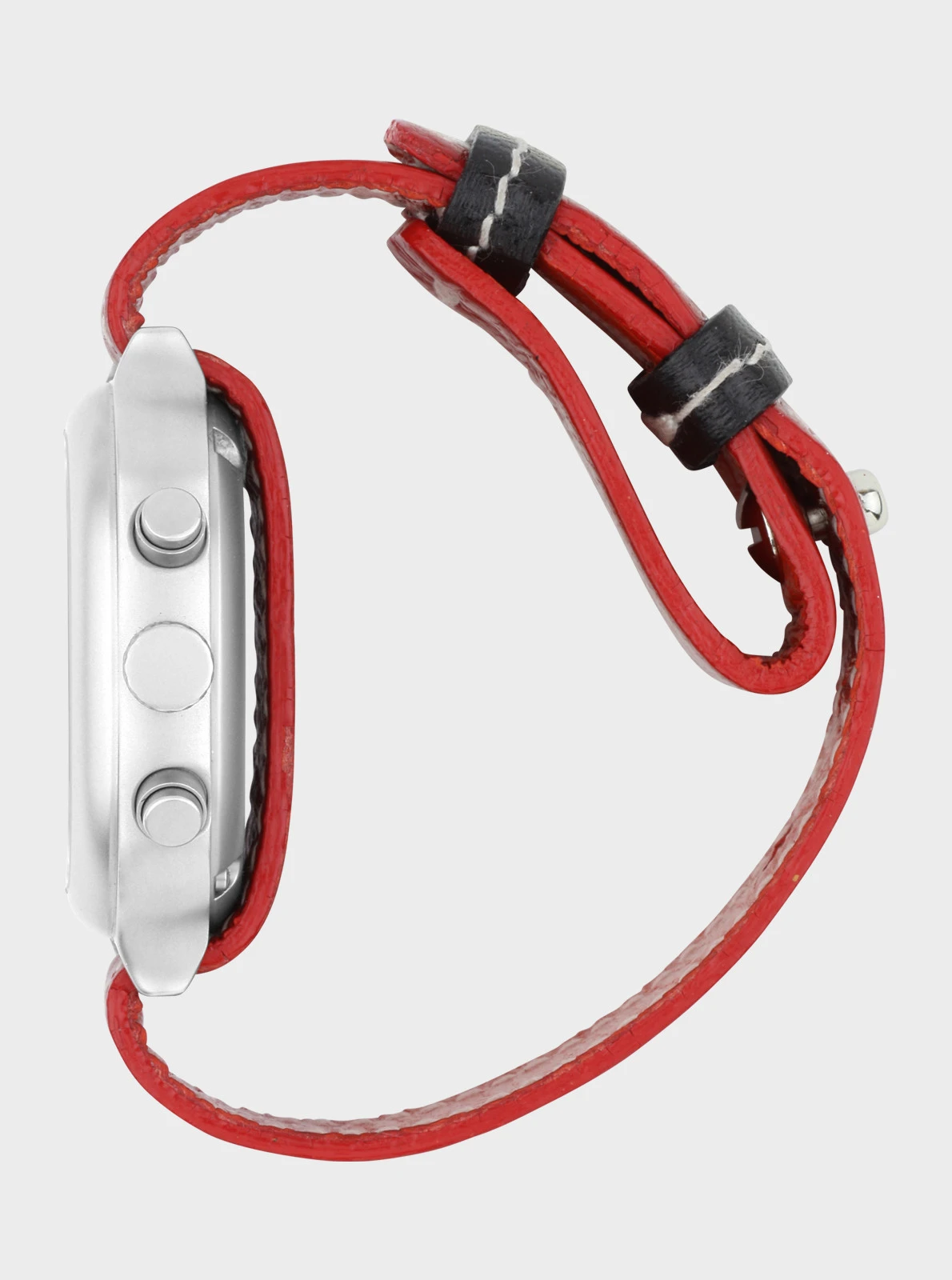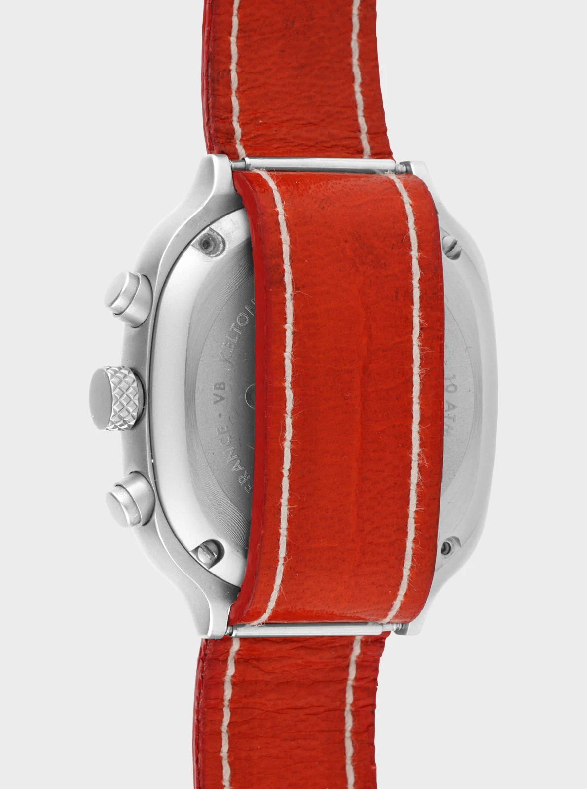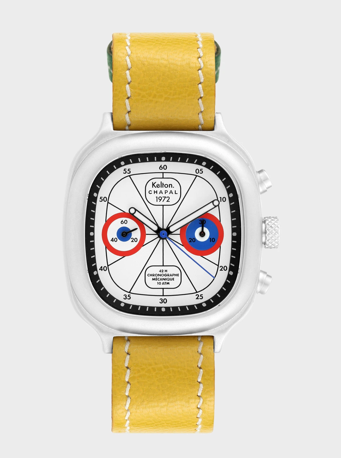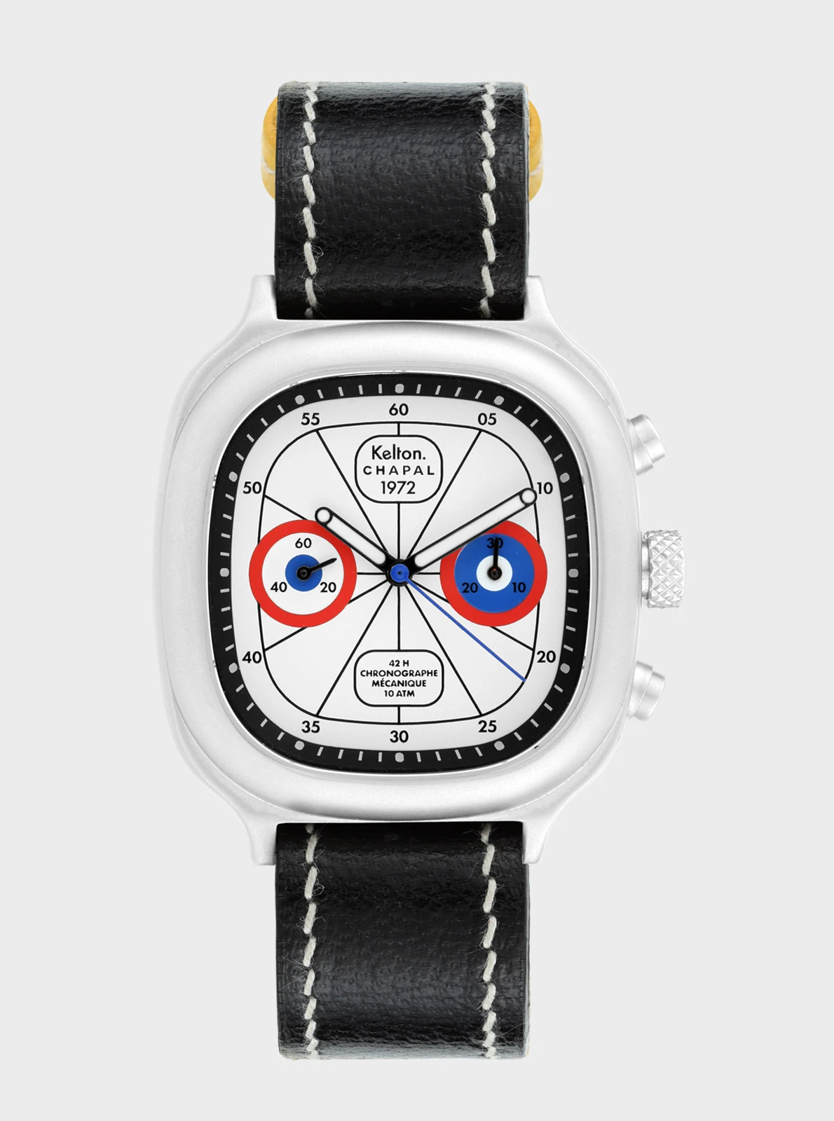Notre chronographe 1972 fait peau neuve. Voici une nouvelle édition ultra limitée dotée d’un cadran minimaliste orné de deux cocardes aux couleurs inversées (à gauche la française, à droite, celle des états-unis (Première Guerre mondiale). Le Chrono Sky Red & Blue célèbre les histoires de Kelton et Chapal qui passent toutes deux par les État-unis.