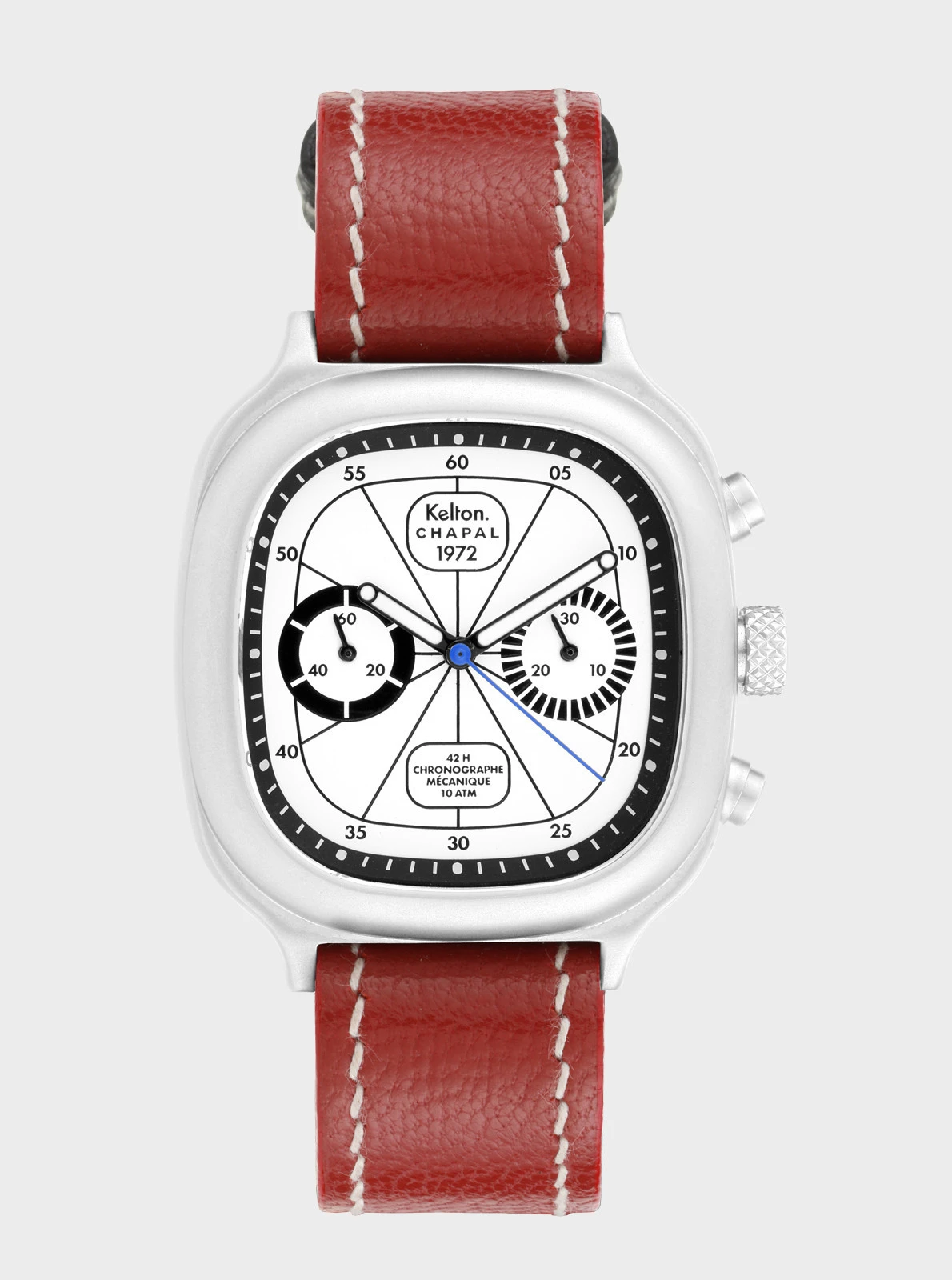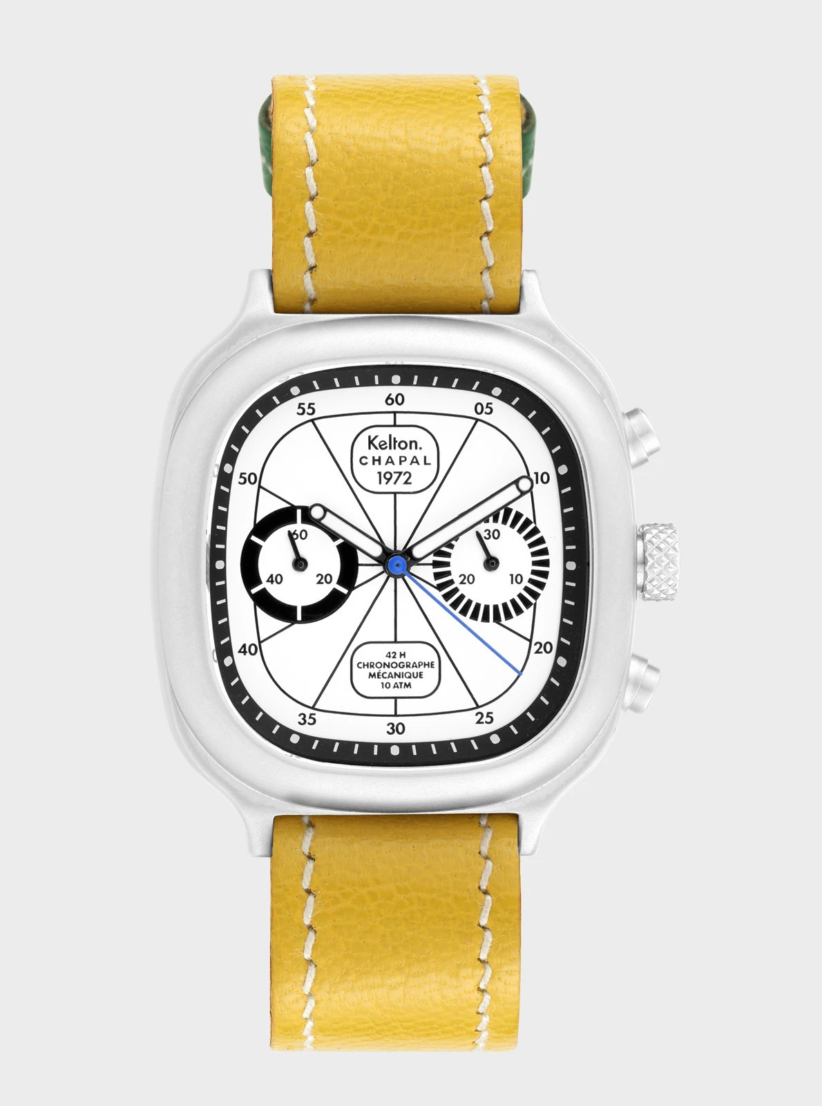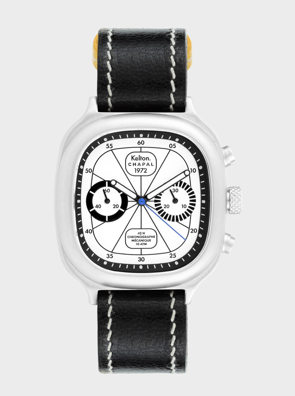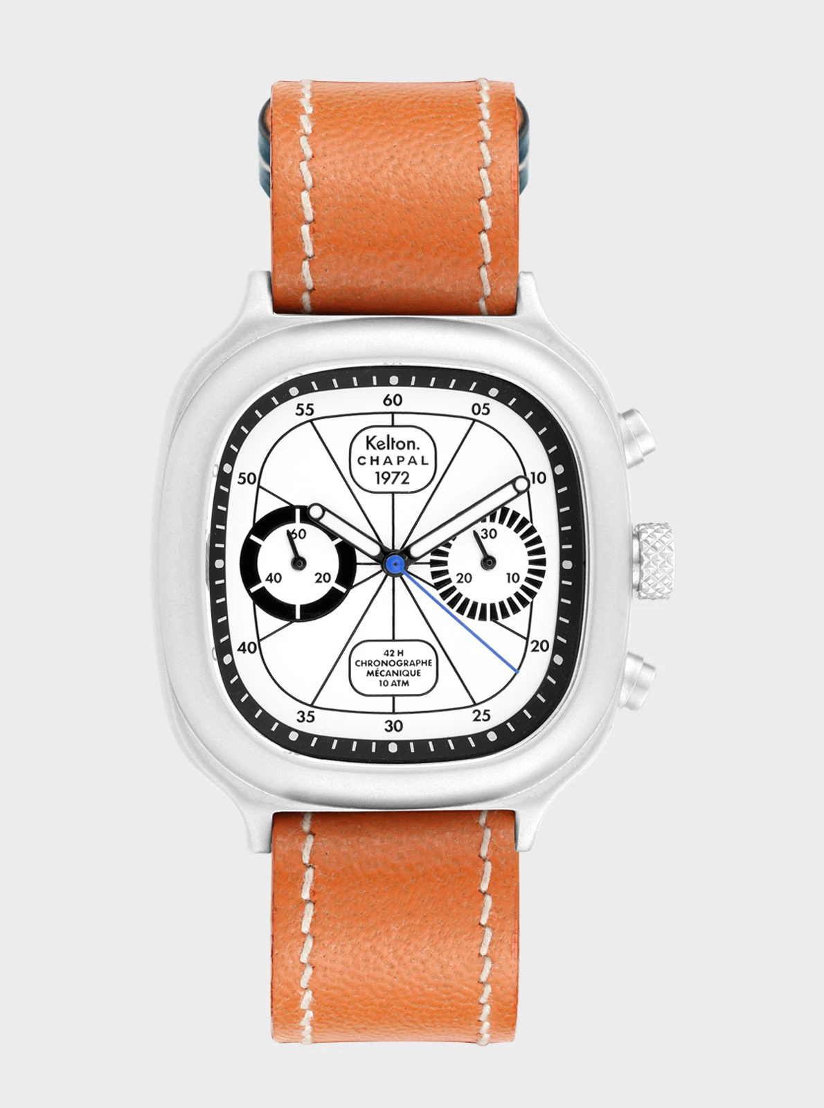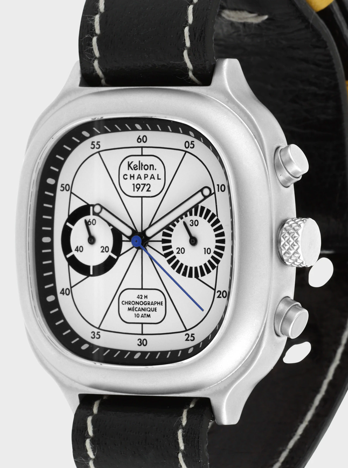 Notre modèle 1972 est un chrono mécanique à remontage manuel. Sportif par essence, il ajoute l’affichage de temps chronométrés à la lecture de l’heure courante. Pour le créer et le développer, nous avons collaboré avec la manufacture Chapal, dont l’histoire est intimement liée à celles de l’aviation et de l’automobile.