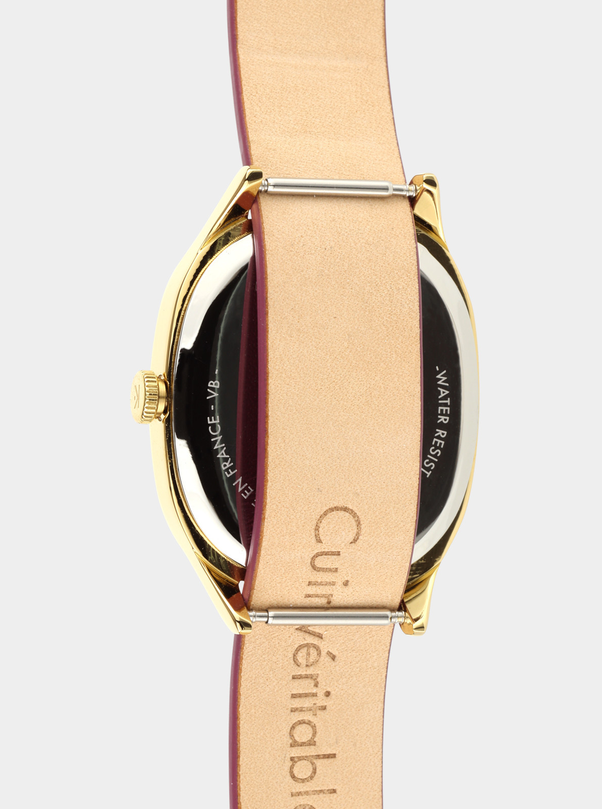 TECHNIQUE Référence 9126222 Entrecorne 14 mm Hauteur corne à corne 38 mm Épaisseur 7 mm Diamètre du boîtier 28-32 mm Boîtier Laiton Couleur du cadran Prune Verre Minéral Étanchéité 3 ATM Poids total 23 g Type de mouvement Quartz Mouvement Miyota super slim Conçue et assemblée en France.