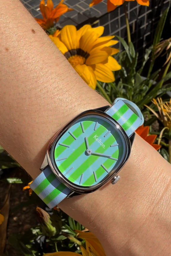 Bienvenue dans la Normandie acidulée de David H. Les couleurs de cette montre Colorama sont un hommage au plus grand peintre vivant (qui comme chacun sait, vit en Normandie et peint les pommiers de son jardin à longueur d’année. Ce vert et ce bleu rappellent le printemps et le soleil… de la Normandie côté Californien, tout de même.