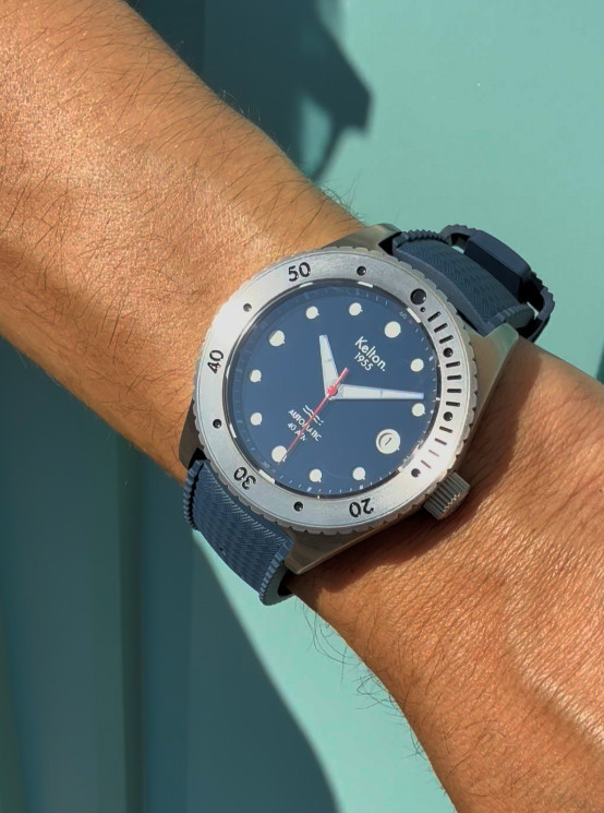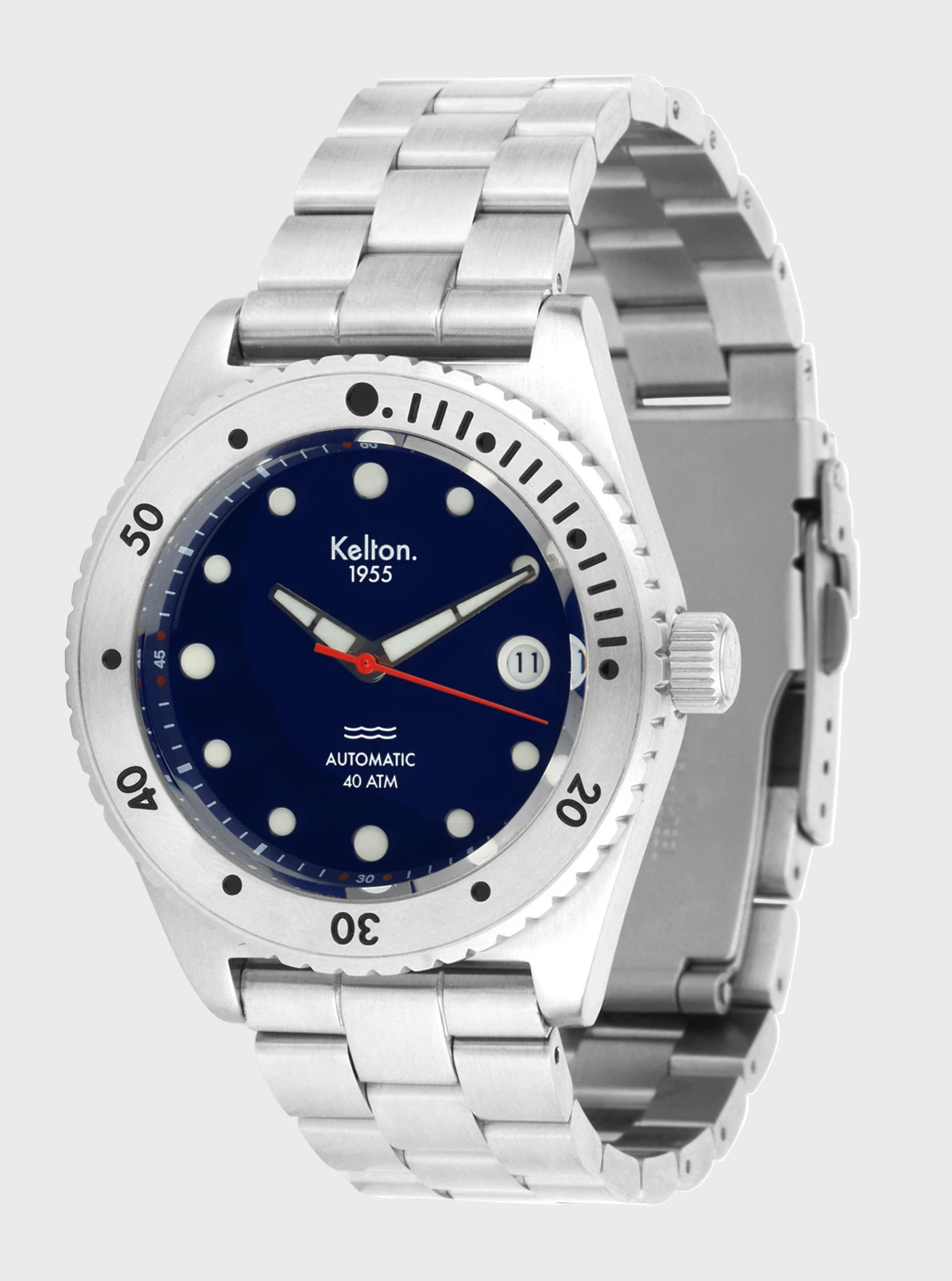 TECHNIQUE Référence 9123942 Entrecorne 20 mm Hauteur corne à corne 47 mm Épaisseur 13 mm Diamètre du boîtier 39,5 mm Boîtier Acier inox 316 L Couleur du cadran Navy Verre Saphir Étanchéité 40 ATM Poids total 153 g Type de mouvement Automatique Mouvement Miyota 8215 Réserve de marche 42 heures Spécificité SuperLuminova (index, aiguilles), boucle déployante réglable et maillons vissés Conçue et assemblée en France. Série limitée et numérotée, 1955 exemplaires.