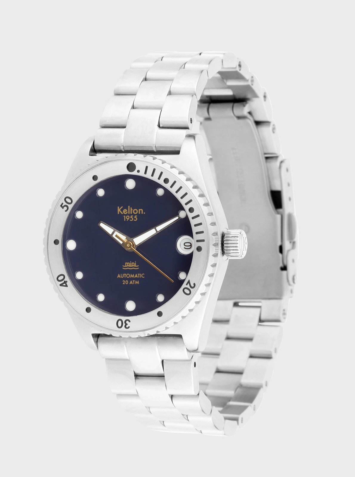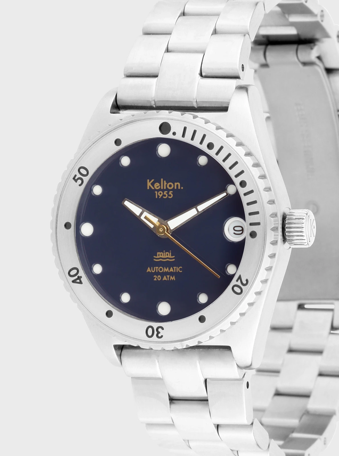 Verre saphir, index et aiguilles Superluminova, lunette à mouvement unidirectionnel, couronne vissée, mouvement automatique. La Mini résiste à une pression de 20 ATM.