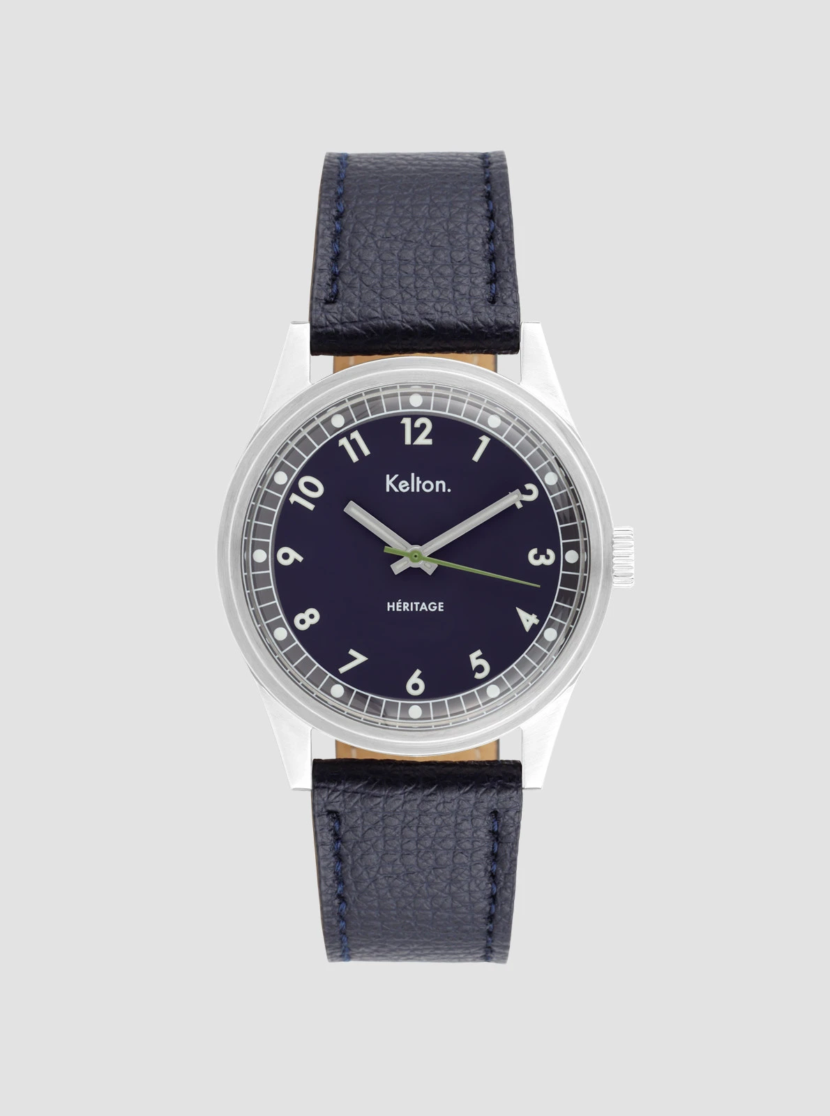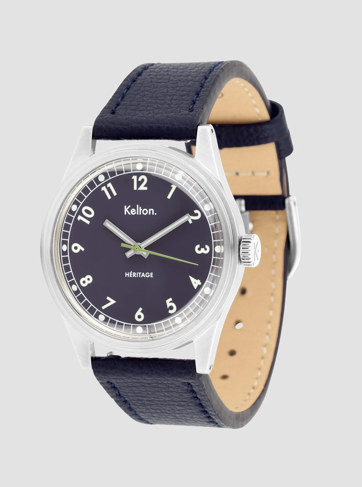L’Héritage navy est le deuxième modèle de cette nouvelle collection majeure. Cette fois, il s’agit d’être discret, autant à l’aise sur un poignet féminin que masculin, avec son petit diamètre (38 mm) elle devient la plus effortless chic de toutes les Kelton. Le cadran navy nous rappelle l’origine de ce modèle, les fameuses dirty dozen, chères à tous les amateurs de garde-temps.