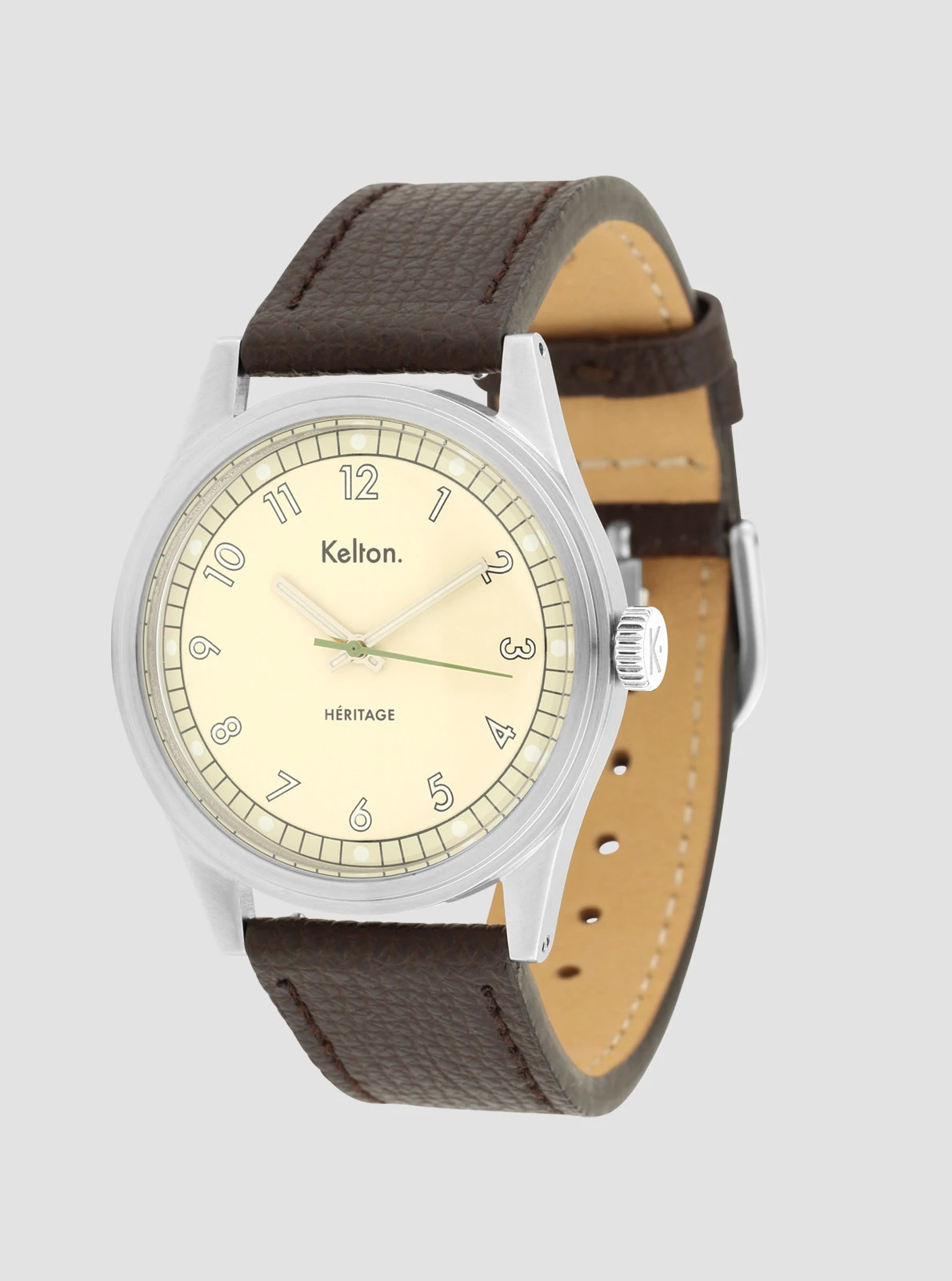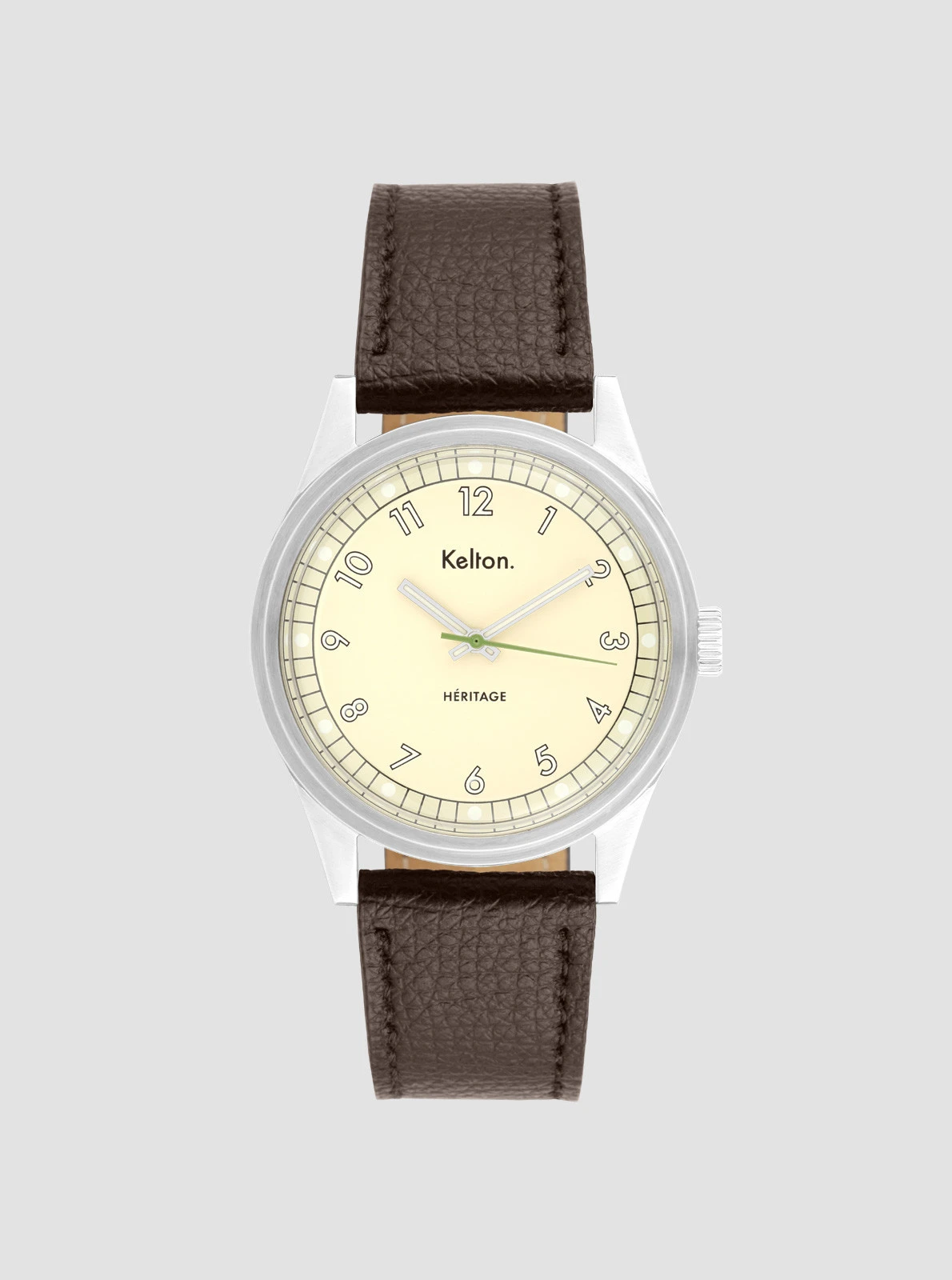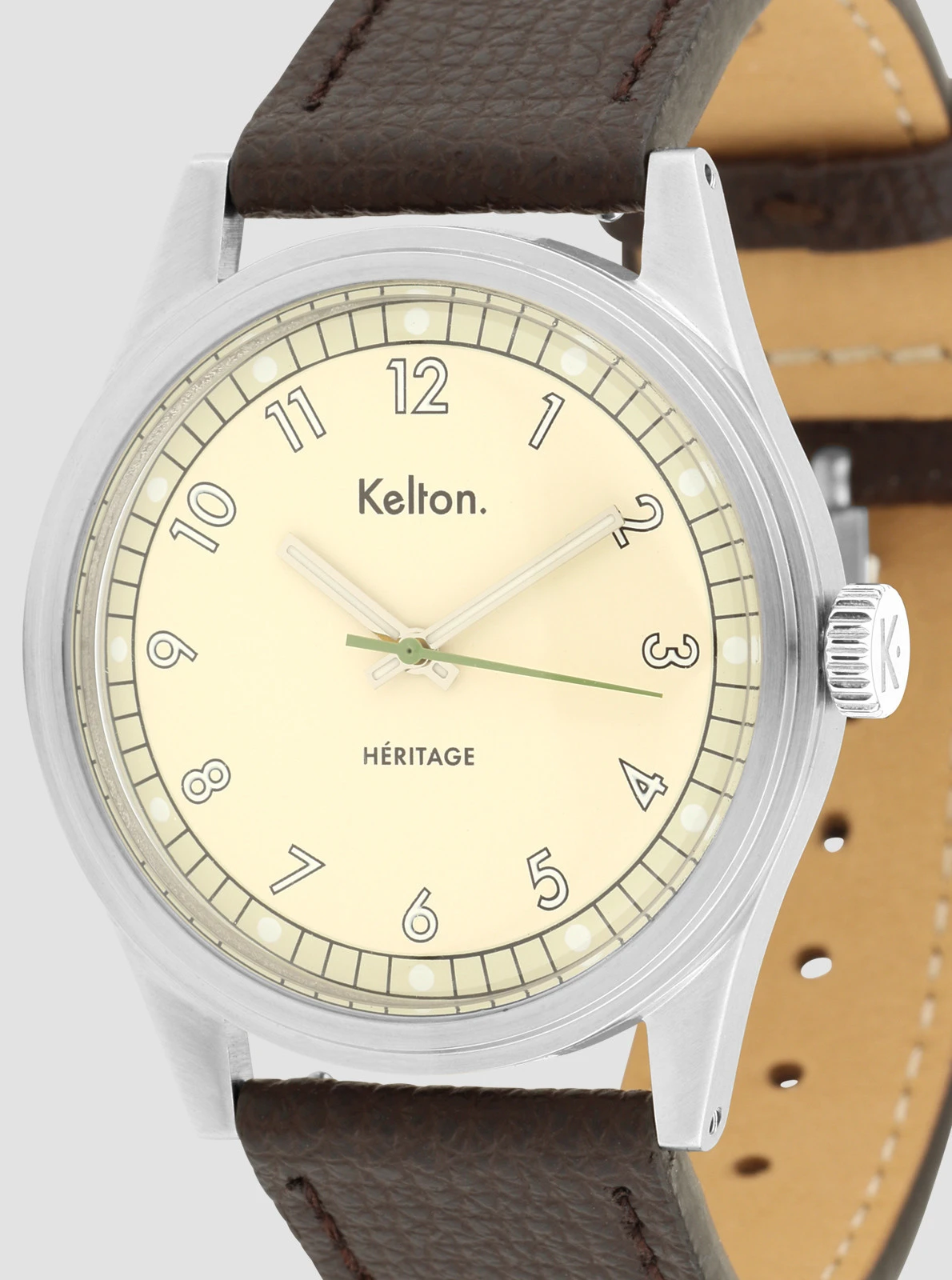 L’Héritage champagne est le troisième modèle de cette nouvelle collection majeure. Cette fois, il s’agit d’être discret, autant à l’aise sur un poignet féminin que masculin, avec son petit diamètre (38 mm) elle est la plus effortless chic de toutes les Kelton. Le cadran champagne fera de ce modèle le plus vintage de la collection, à n’en point douter.