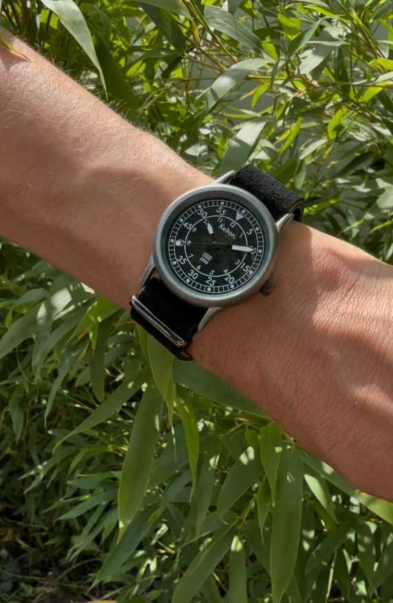 Elle revient en laiton plaqué gris titane et sablé (antireflet) afin que votre présence au cœur de la forêt reste inaperçue. Son cadran a été re-designé, dans l'optique de rester toujours plus proche des origines du modèle avec ses index disposés en chemin de fer. Quant aux aiguilles, elles conservent leur forme glaives typique des montres militaires. Nous leur avons adjoint une trotteuse lollipop, pour faire bonne mesure.