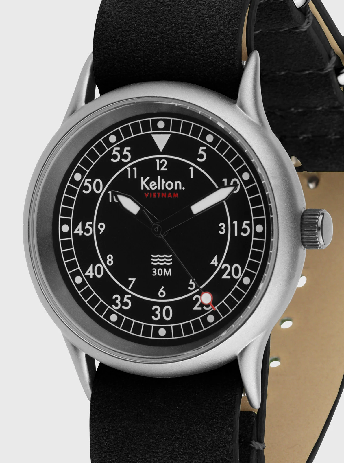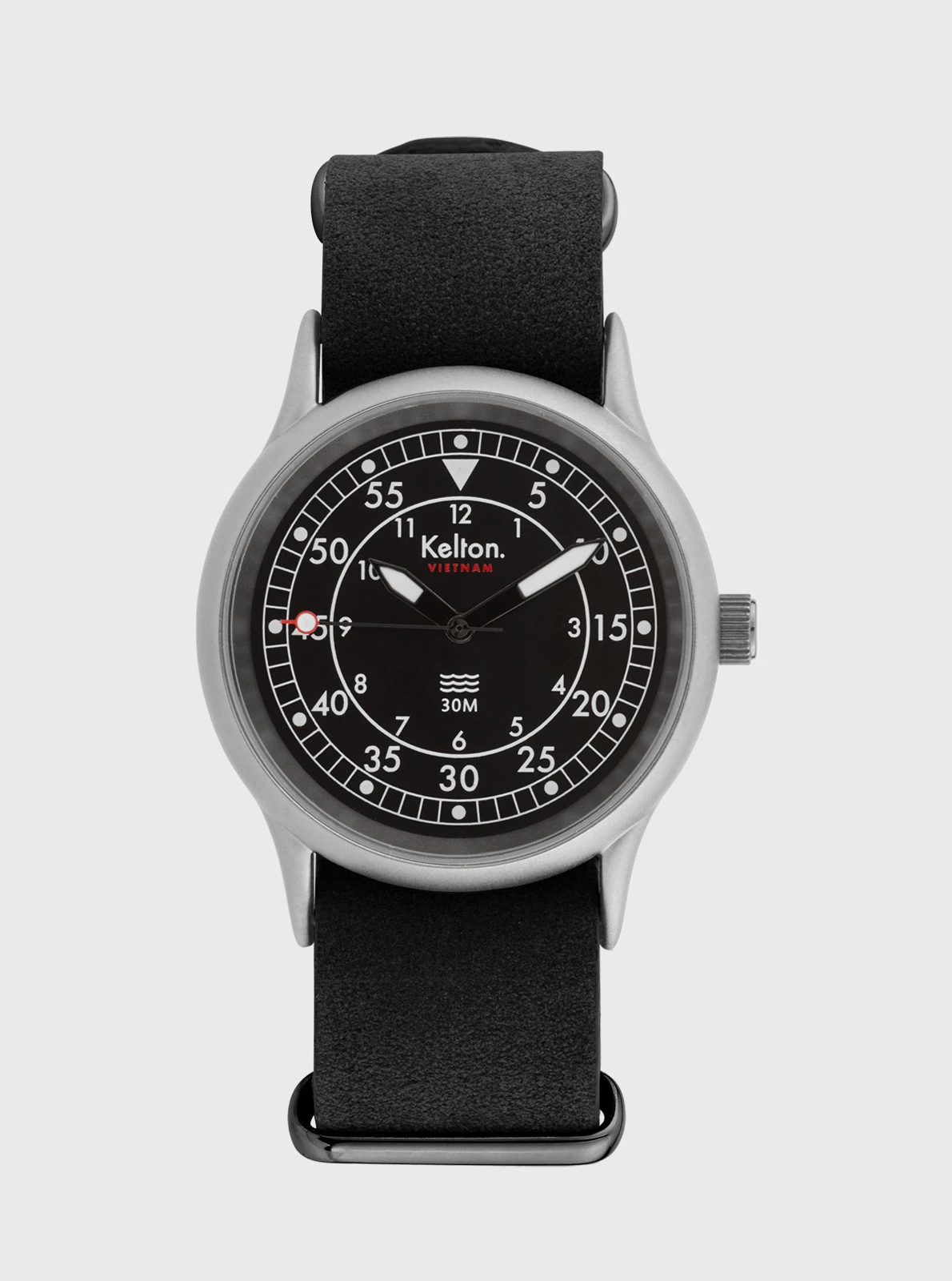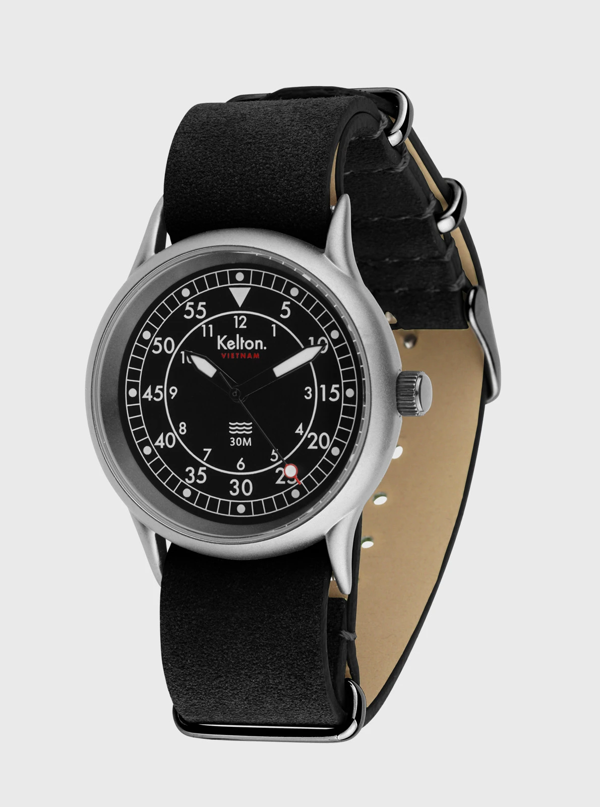 Ce modèle est équipé d’un bracelet NATO en cuir disponible en 3 couleurs, forêt, sable et carbone.