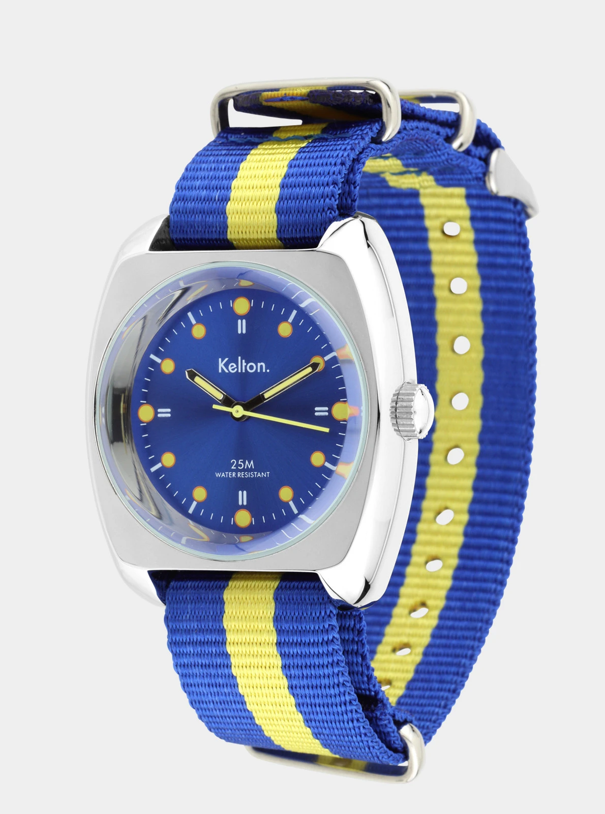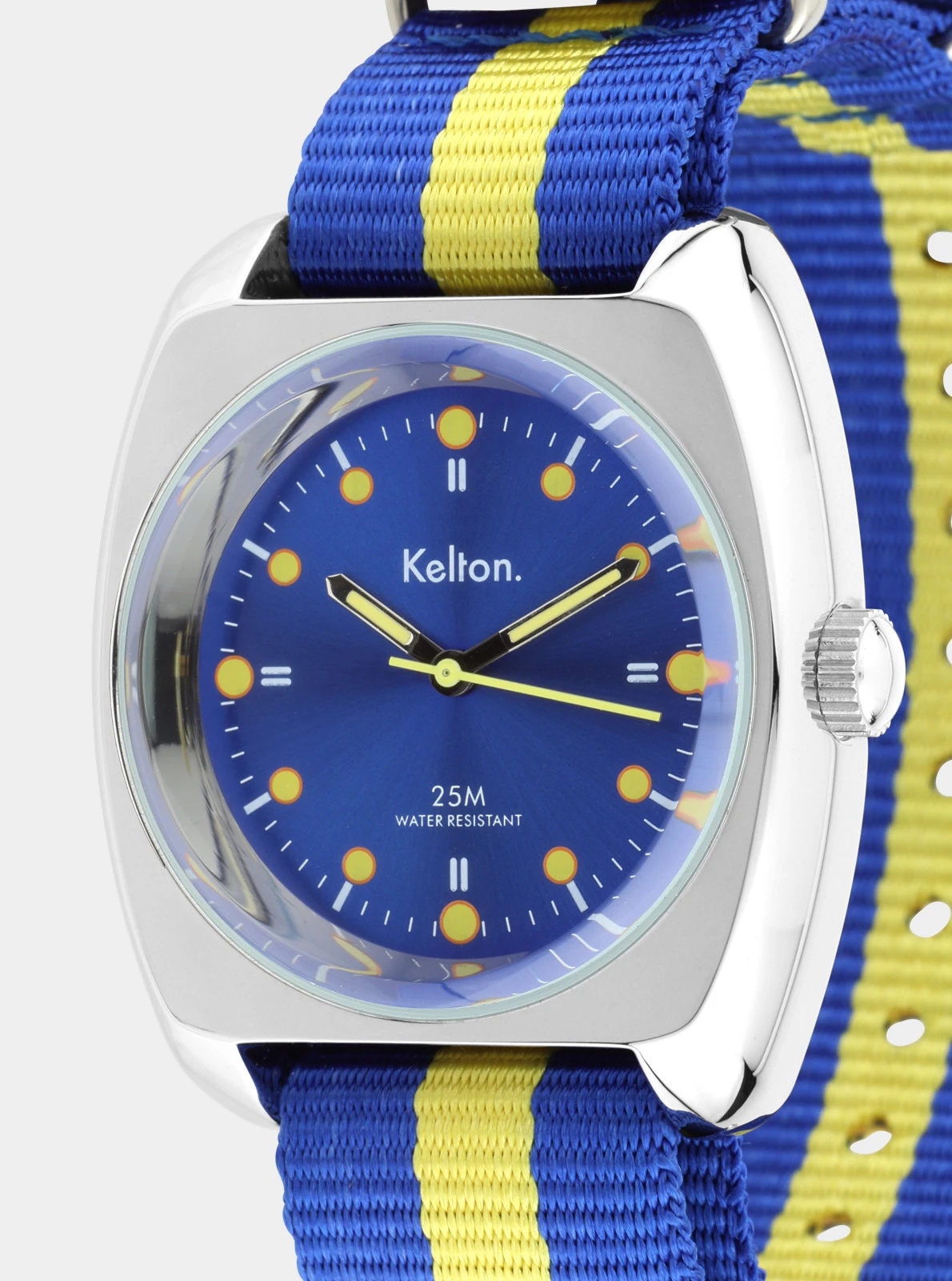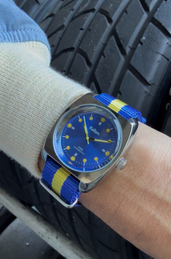 Un boitier de muscle car, cadran bleu roi et index jaunes qui matchent avec son bracelet NATO, cette RC 2 sort tout droit des meilleures éditions des 500 miles d’Indianapolis.