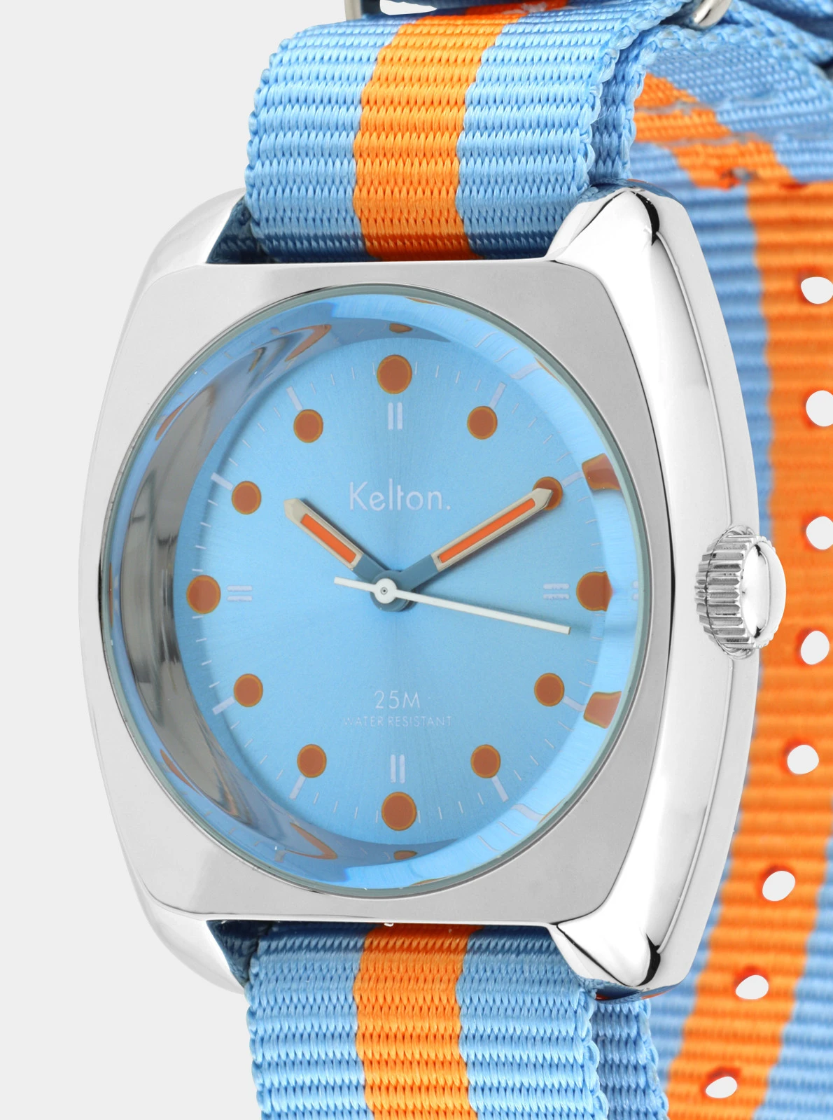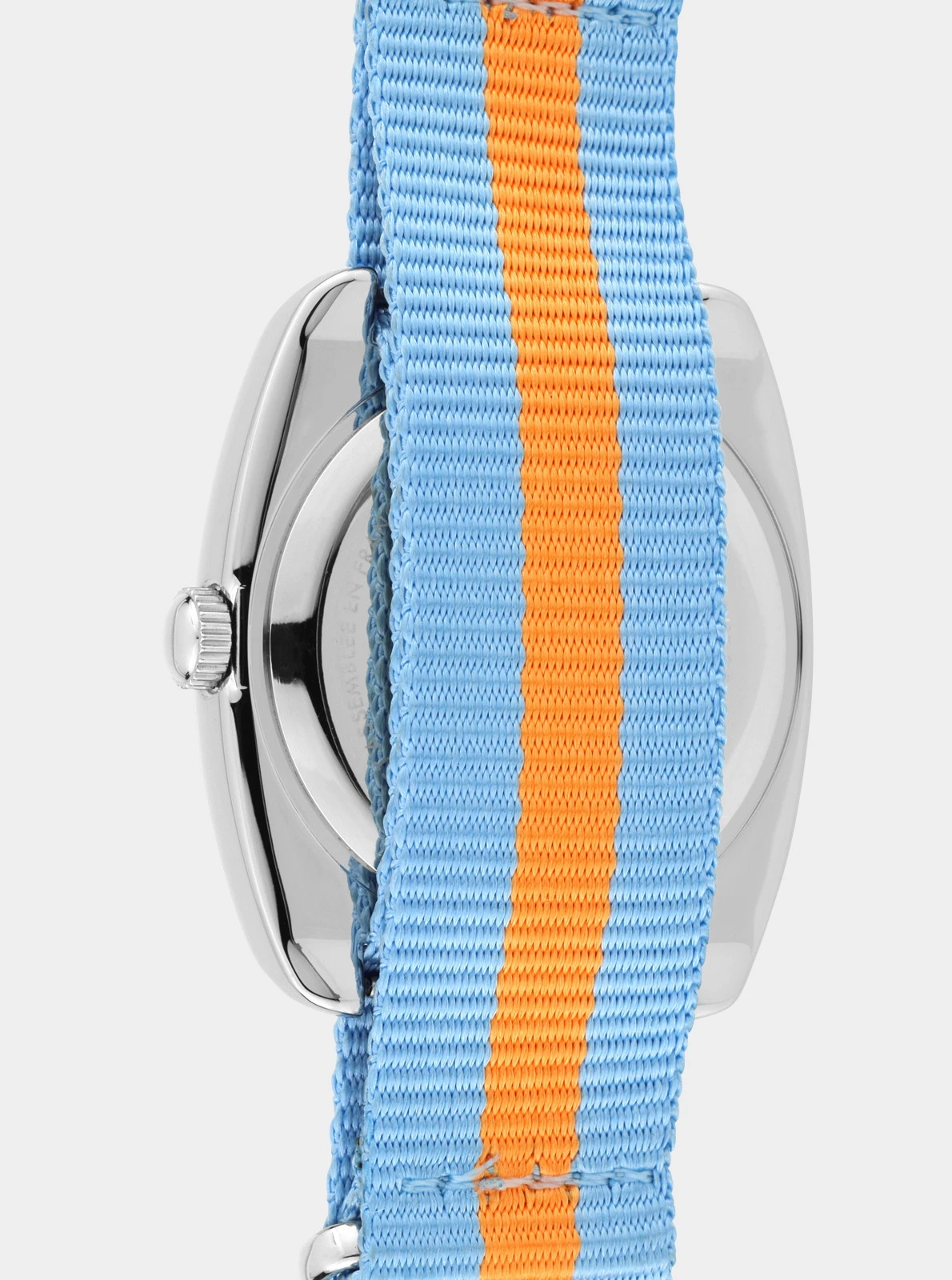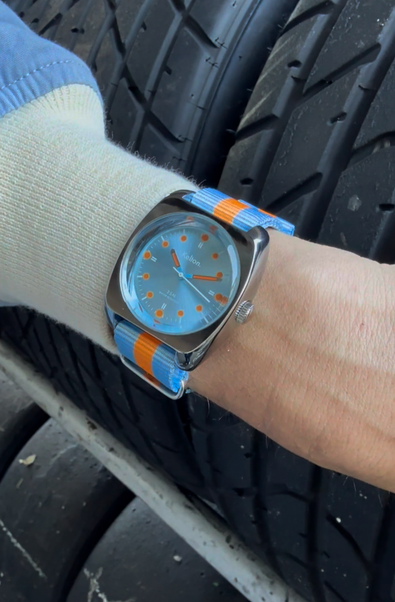 Un boitier de muscle car, cadran bleu ciel et index oranges qui matchent avec son bracelet NATO bleu et orange, clin d’œil à la livrée Gulf, qui marqua le monde de la course automobile des 60’s.