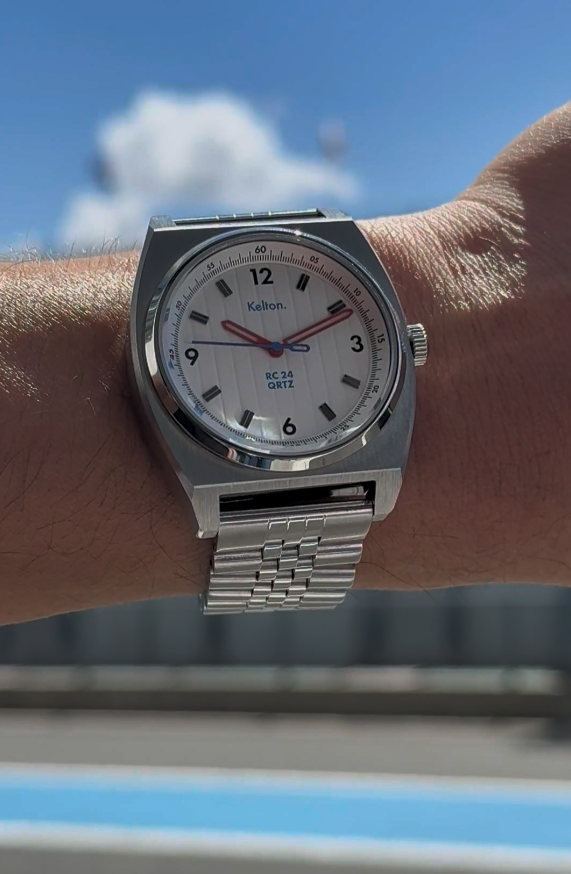 Dans l’écurie RC 24, voici la QRTZ*. Toujours ce boitier acier brossé 616 L au design augmenté en finesse et nervosité, avec cette fois un petit truc en plus : pas un aileron arrière, non, mais un joli travail sur le cadran, finement rainuré (gage d’une plus grande adhérence dans les virages).