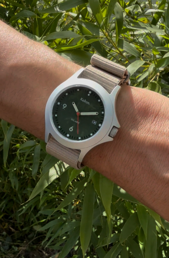 TECHNIQUE Référence 9125552 Entrecorne 20 mm Hauteur corne à corne 46 mm Épaisseur 11 mm Diamètre du boîtier 38 mm Boîtier Aluminium Couleur du cadran Kaki Verre Minéral Étanchéité 5 ATM Poids total 38 g Type de mouvement Solaire à Quartz Mouvement Epson AS 32 - 3 Aiguilles Conçue et assemblée en France.
