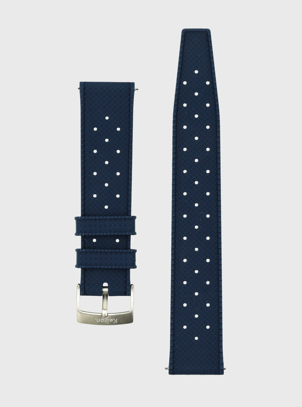 Introducing our "Tropic" bracelet, a classic revived from the sixties, like Kelton. The Tropic bracelet has always been the faithful companion of divers and other water sports enthusiasts, thanks to two major qualities: flexibility and resistance. Our Tropic bracelet, which today equips the 1955 models, is made - as it was then - from vulcanized natural rubber, a process that uses high temperatures and sulfur to modify the rubber's structure and make it more resistant without altering its suppleness.