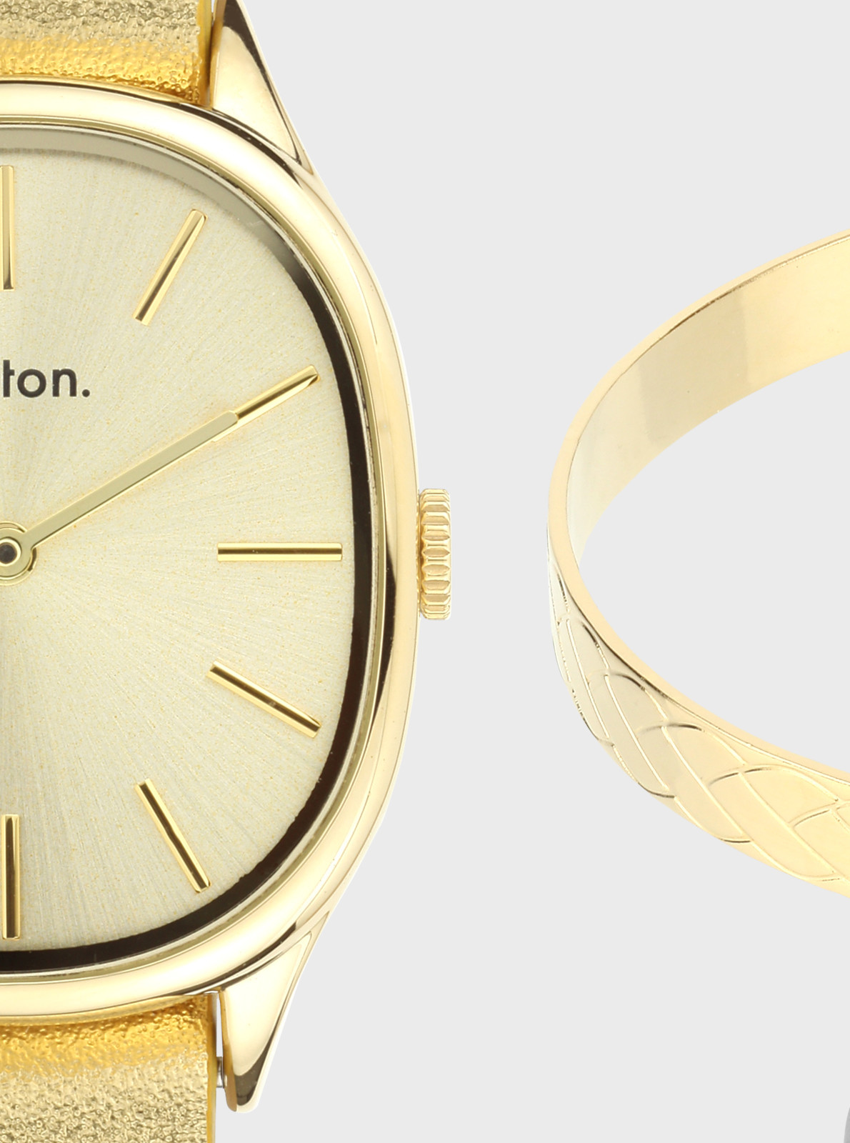 Neither round nor square, it's just as pop as its big sister. Very Warholian, in fact. Interchangeable bracelet.