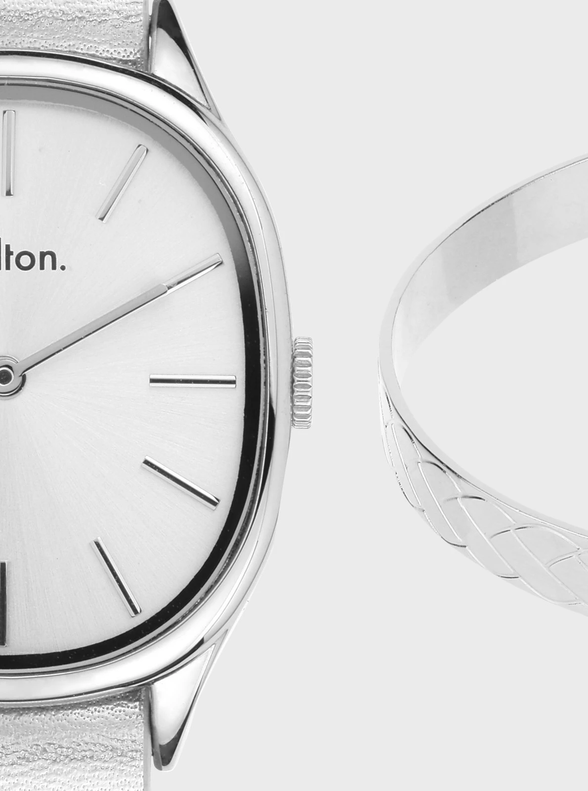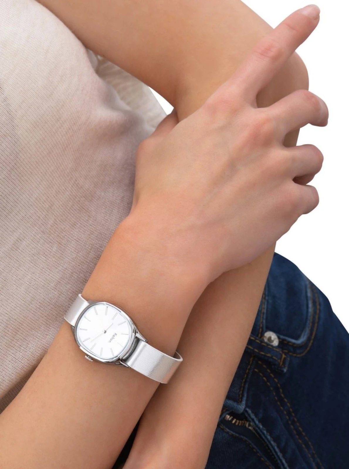 Neither round nor square, it's just as pop as its big sister. Very Warholian, in fact. Interchangeable bracelet.