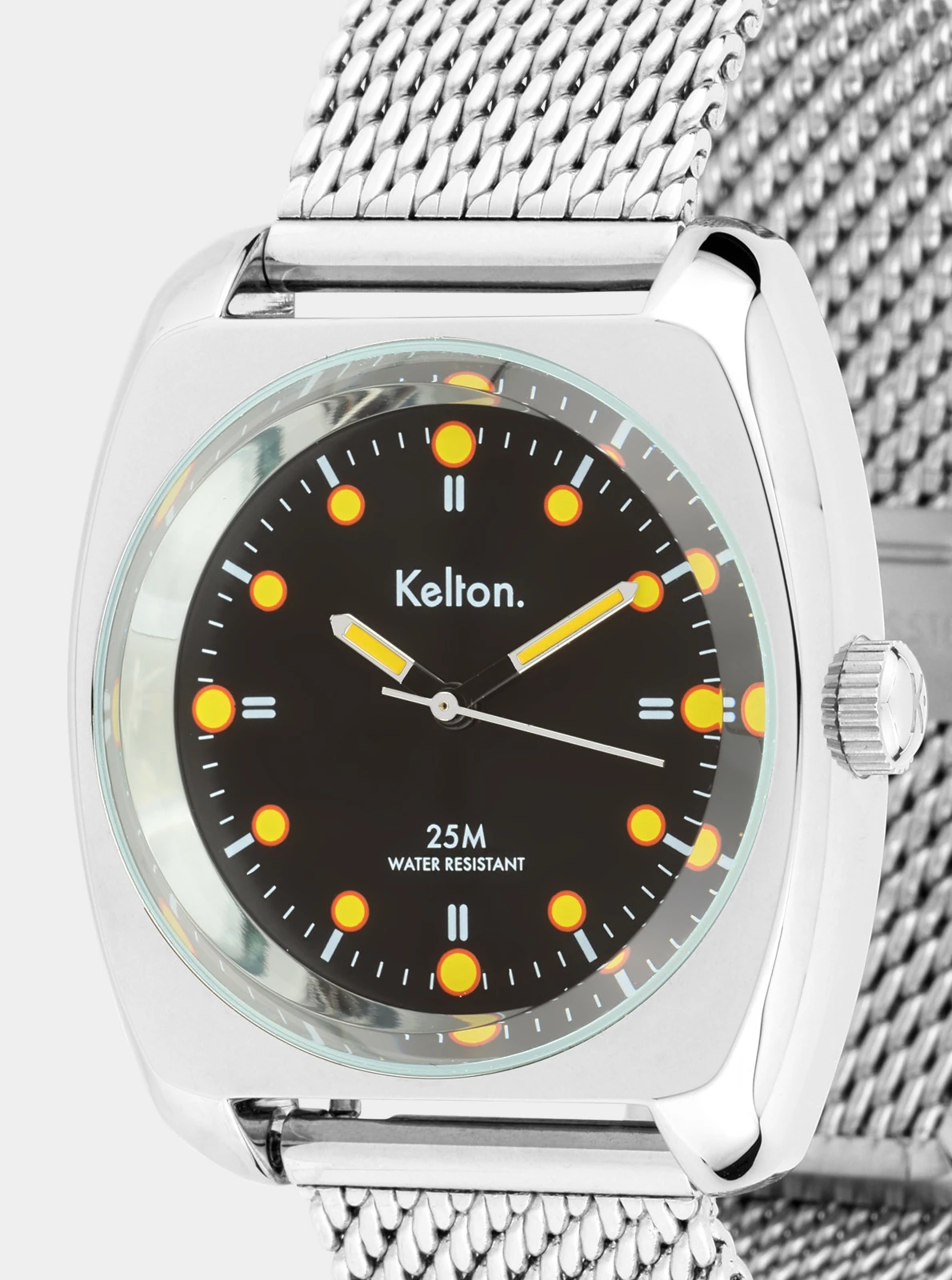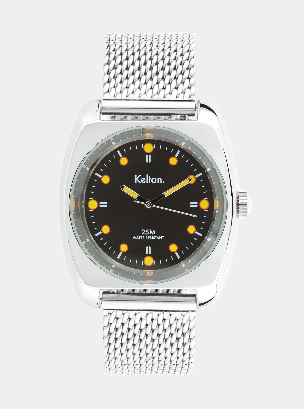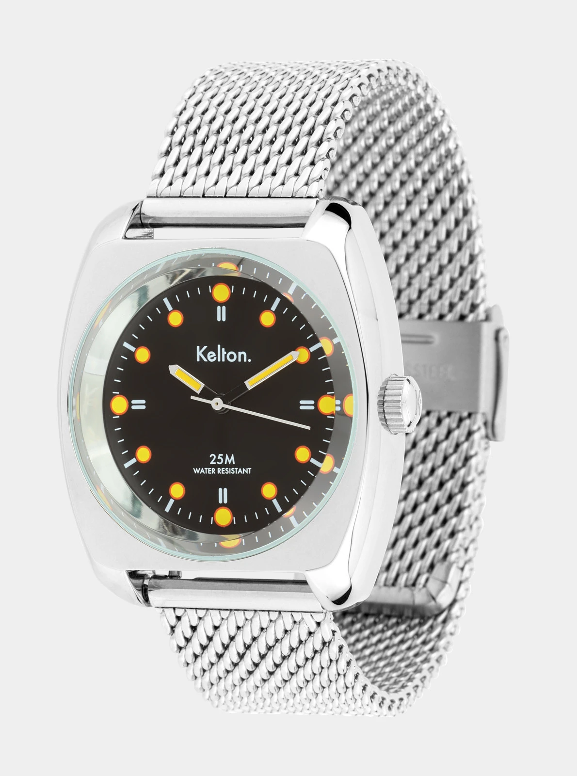 With its sturdy muscle car case, black dial, orange indexes and its mesh bracelet, the RC 2 is straight out of the best Indy 500 editions.